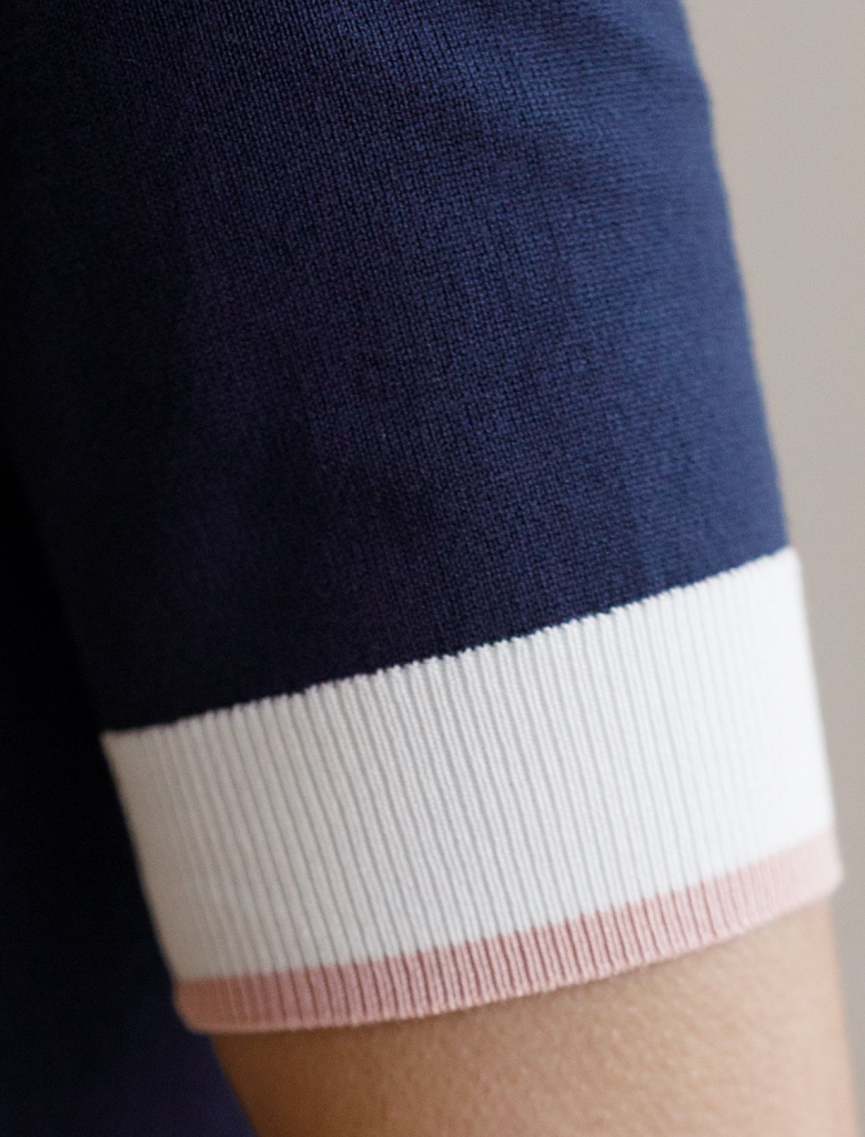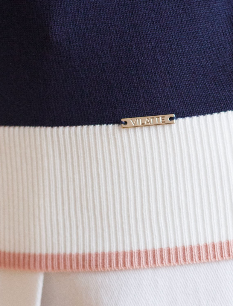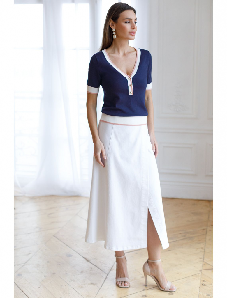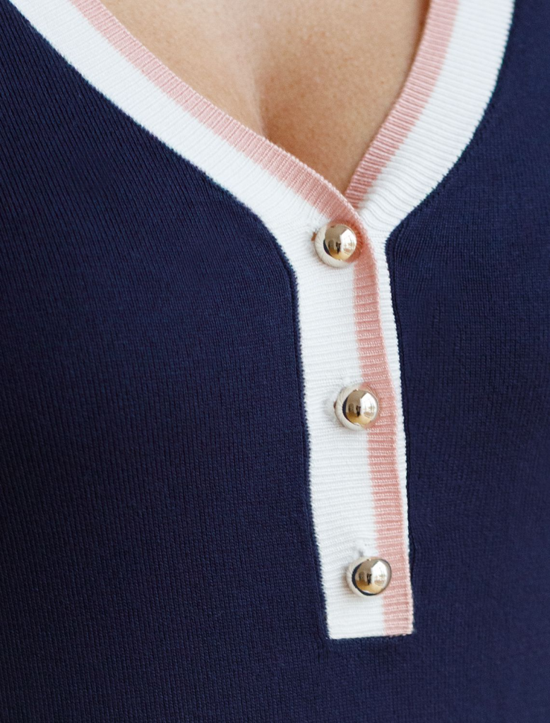 Легкий джемпер темно-синего цвета с V-вырезом идеально подходит на весну и лето. Тонкая вязка из вискозы дарит приятный комфорт и ощущение свежести в теплую погоду. Полуприлегающий крой подчеркивает силуэт, а универсальная длина позволяет сочетать джемпер с разными элементами гардероба. V-вырез с пуговицами подчеркивает зону декольте и визуально вытягивает шею, делая фигуру более изящной. Контрастная отделка добавляет стильный акцент, создавая выразительный образ. Джемпер отлично смотрится на больших размерах благодаря продуманному крою и полуприлегающему фасону. Этот джемпер с коротким рукавом станет незаменимой частью гардероба в сезоны, когда хочется легкости и элегантности одновременно. Лаконичный дизайн обеспечивает простоту комбинирования с другими вещами и будет универсальной базой для создания разнообразных комплектов — от офисного до непринужденного городского стиля.