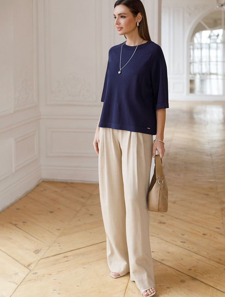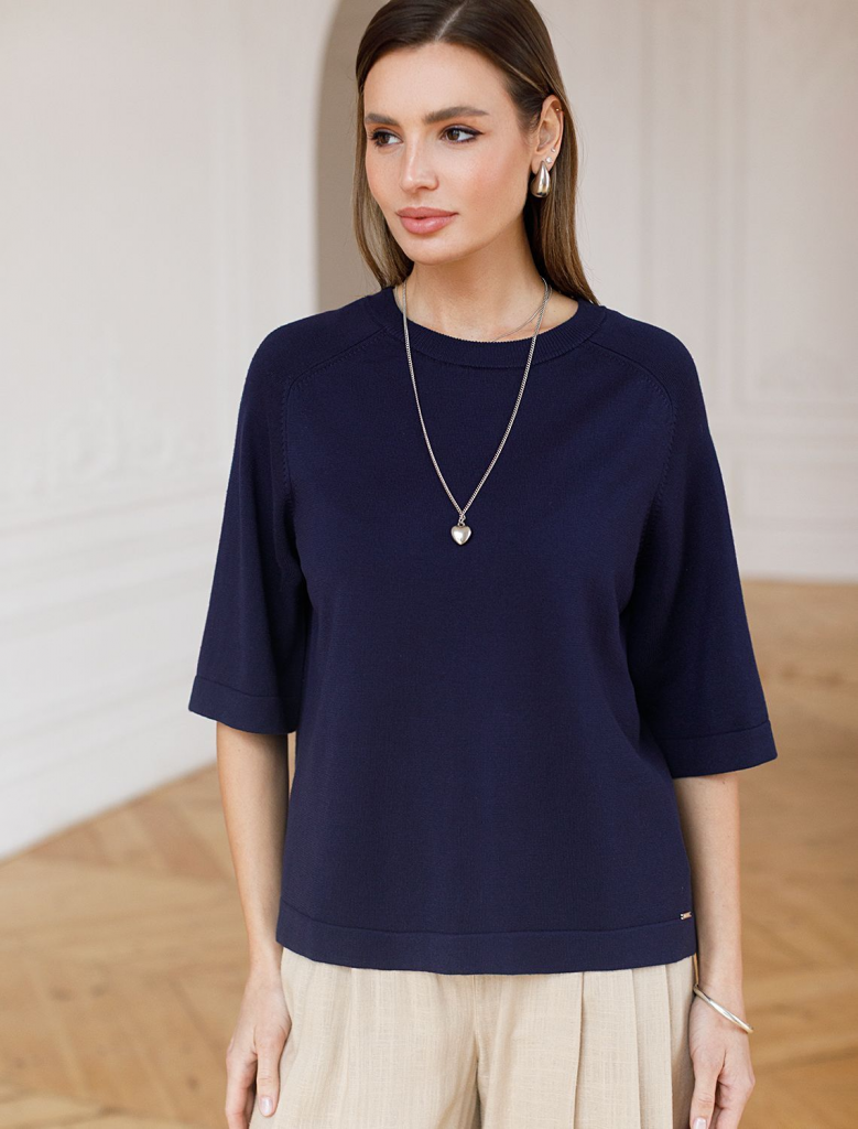 Легкий свободный джемпер темно-синего цвета с круглым вырезом идеально подходит на весну и лето. Тонкая вязка из вискозы дарит приятный комфорт и ощущение свежести в теплую погоду. Универсальная длина позволяет сочетать джемпер с разными элементами гардероба. Джемпер отлично смотрится на больших размерах благодаря продуманному крою и свободному фасону. Широкие рукава создают воздушность и делают силуэт особенно женственным. Этот джемпер с рукавом 3/4 станет незаменимой частью гардероба в сезоны, когда хочется легкости и элегантности одновременно. Лаконичный дизайн обеспечивает простоту комбинирования с другими вещами и будет универсальной базой для создания разнообразных комплектов — от офисного до непринужденного городского стиля.