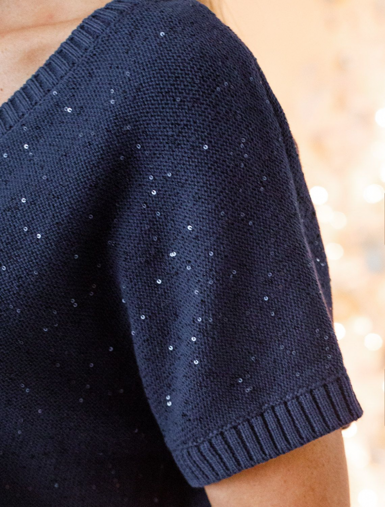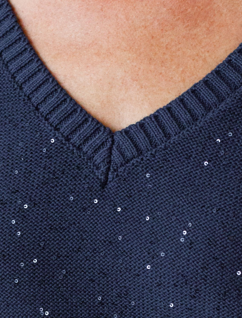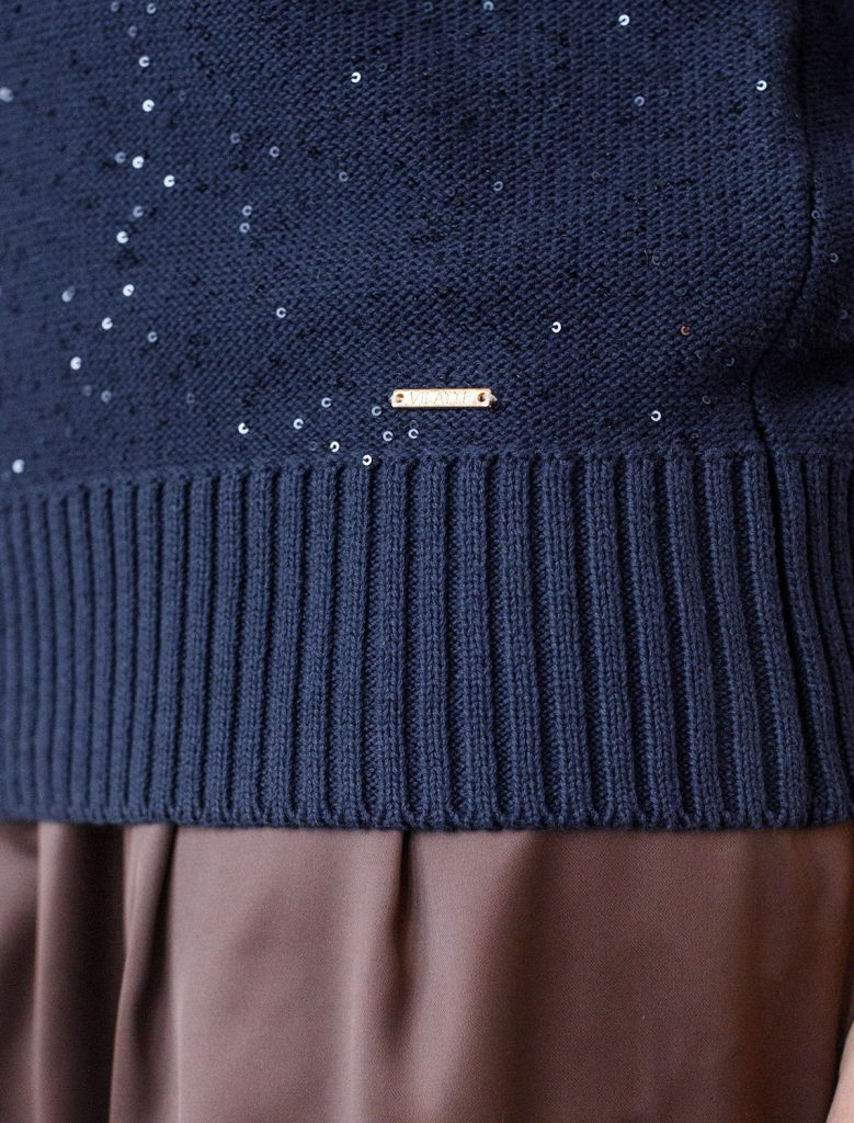 Легкий джемпер благородного синего цвета с V вырезом и коротким рукавом выполнен из хлопковой пряжи с вкраплением сияющих пайеток, что придает особую изысканность. Нарядный джемпер связан изнанкой, пряжа отличается легкостью и приятной текстурой, совершенно не колется, обеспечивает комфорт даже при длительном использовании, а натуральные волокна поддерживают оптимальный температурный баланс. Свободный крой с эластичной манжетой по низу и цельнокроенный рукав создают расслабленый, но аккуратный образ. Умеренно открытое декольте вытягивает шею и подчеркивает ее изящество. Стильный джемпер подойдет девушкам и женщинам больших размеров, в нем вы будете чувствовать себя уверенно и свободно в любой ситуации. Блестящий эффект пайеток добавляет образу выразительности и индивидуальности. Мерцающее полотно добавляет особого шарма вашему образу, делая его уместным как на праздник, так и для повседневного выхода. Новый год, вечеринка или любое другое мероприятие пройдут ярко — сияющие пайетки создают ощущение праздника в каждом движении. Для спокойного повседневного аутфита добавьте к этому эффектному джемперу спокойный низ, близкий по цвету, без дополнительных элементов декора.