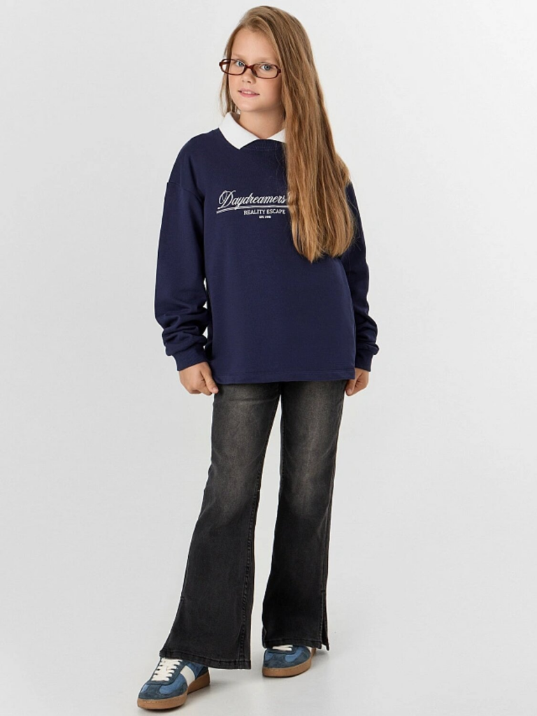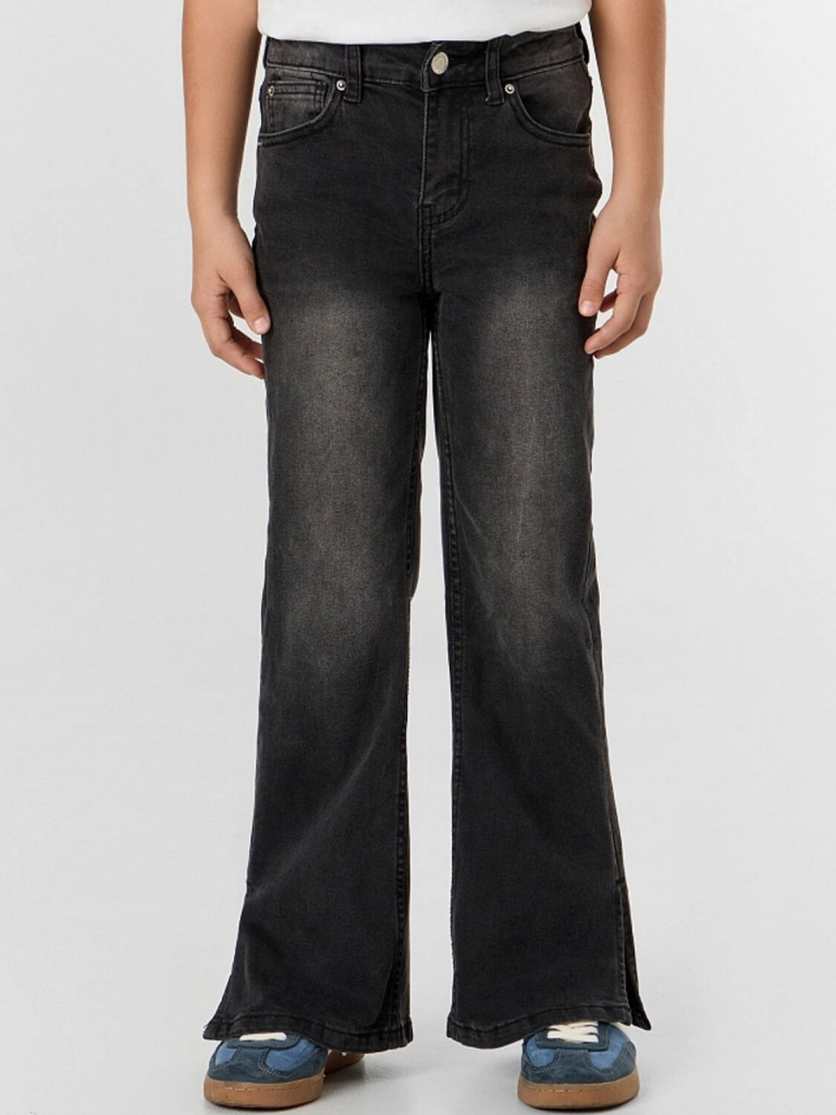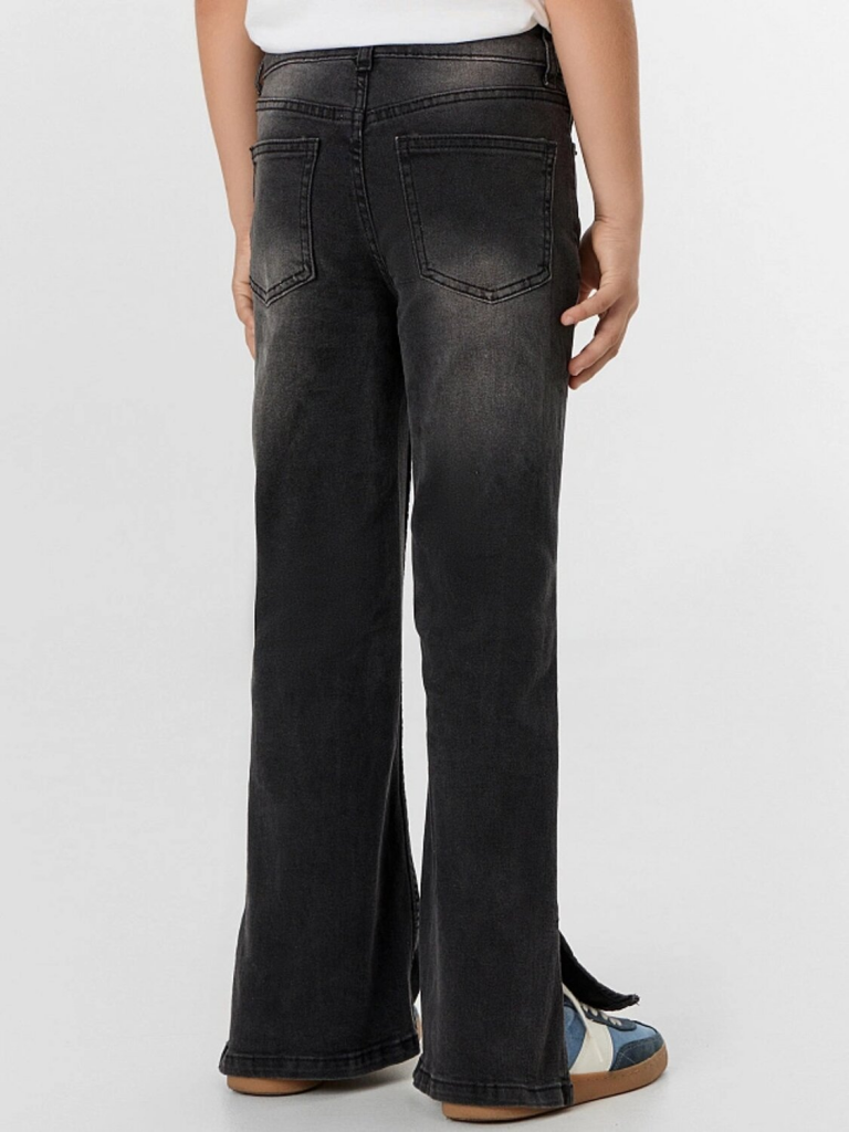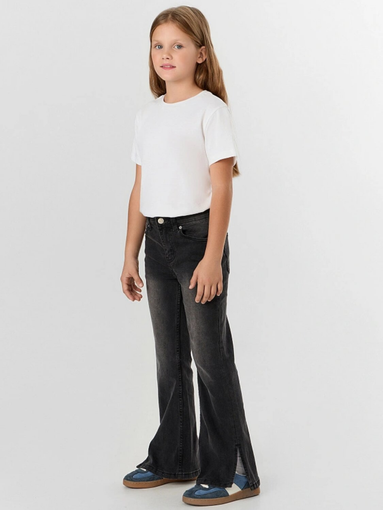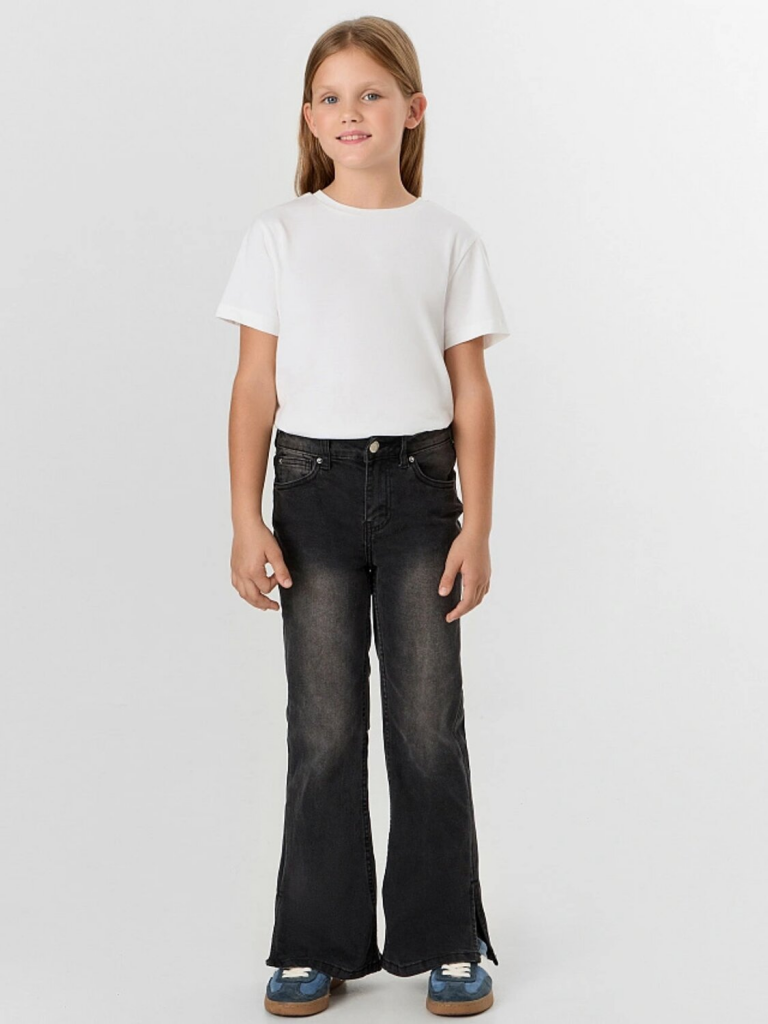 Черные джинсы для девочек с эффектом потертости — стильный и практичный выбор для юной модницы. Модель мягко облегает бедра и плавно расширяется от линии колена, создавая элегантный и вытянутый силуэт, который остается актуальным в любом сезоне.