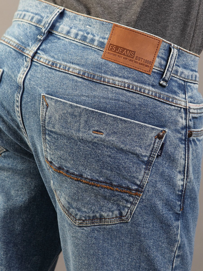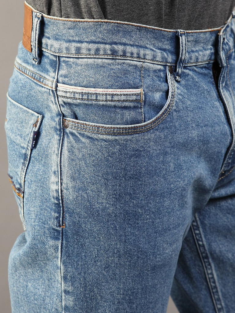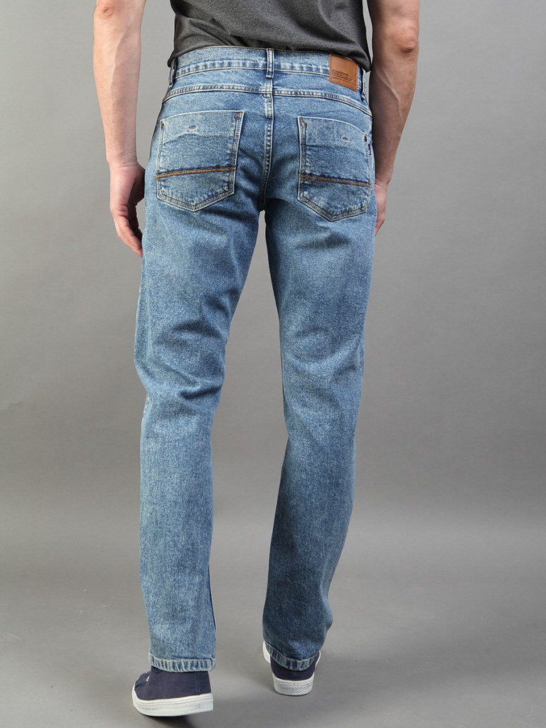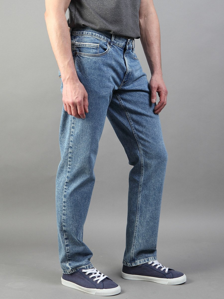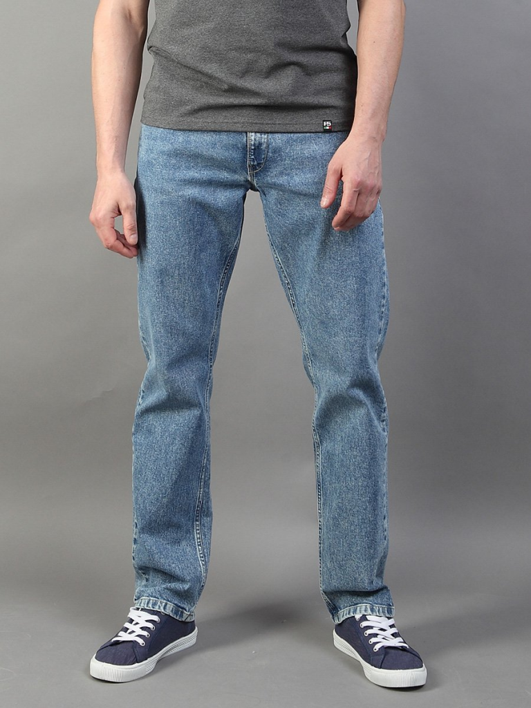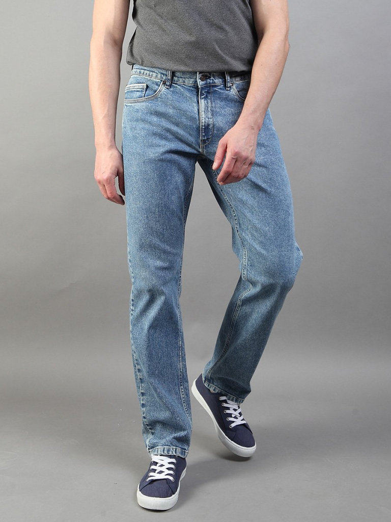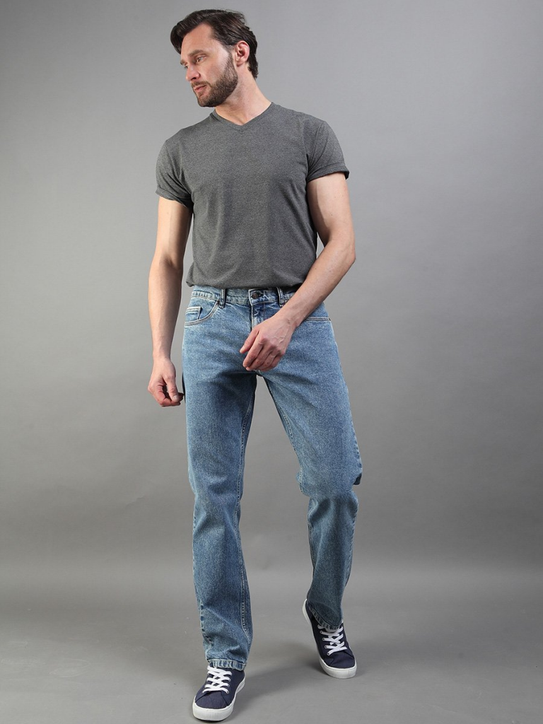 Мужские модные джинсы с пятью карманами, на части швов сделаны тройные отстрочки разными нитками, в качестве отделки использована двухцветная тесьма на часовом кармане, под поясом и на внутренней части пояса. Посадка Regular fit (полуоблегающие по бедру), низкая высота талии спереди и высокая сзади. Застежка на молнии. Зауженные по низу. Выполнены из слабоэластичной ткани denim comfort stretch. Специальная средняя стирка "towel wash", мраморный эффект. Параметры указаны для размера 32. Длина внутреннего шва - 83, 5 см. ,