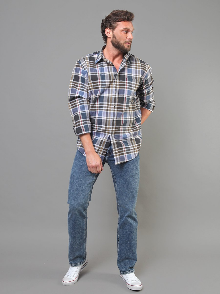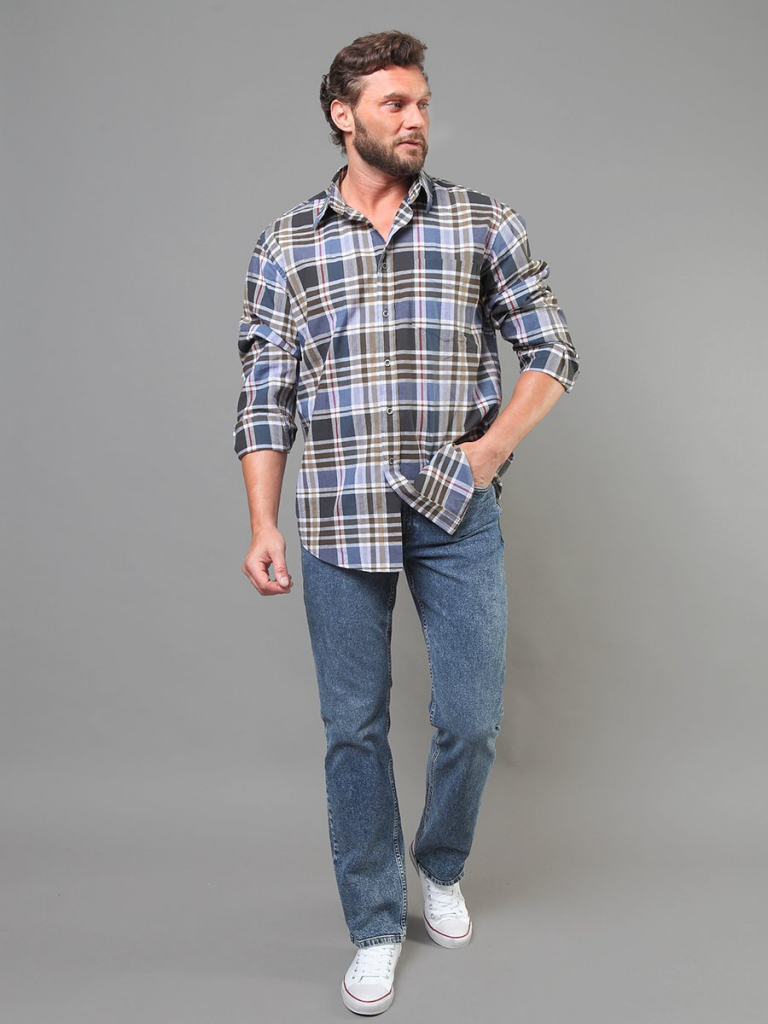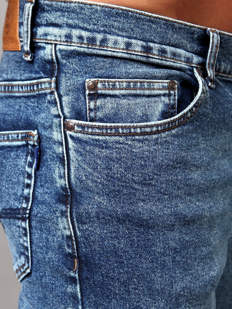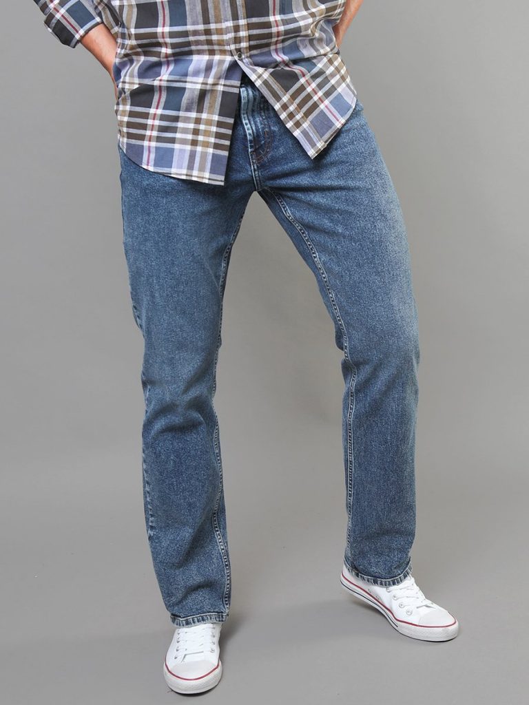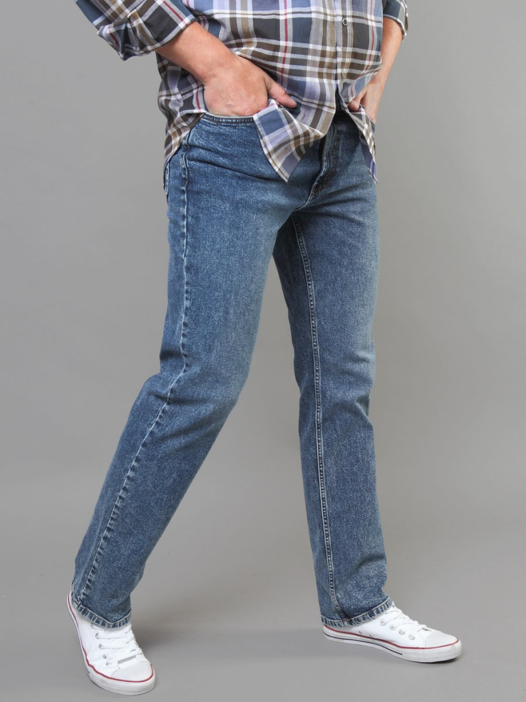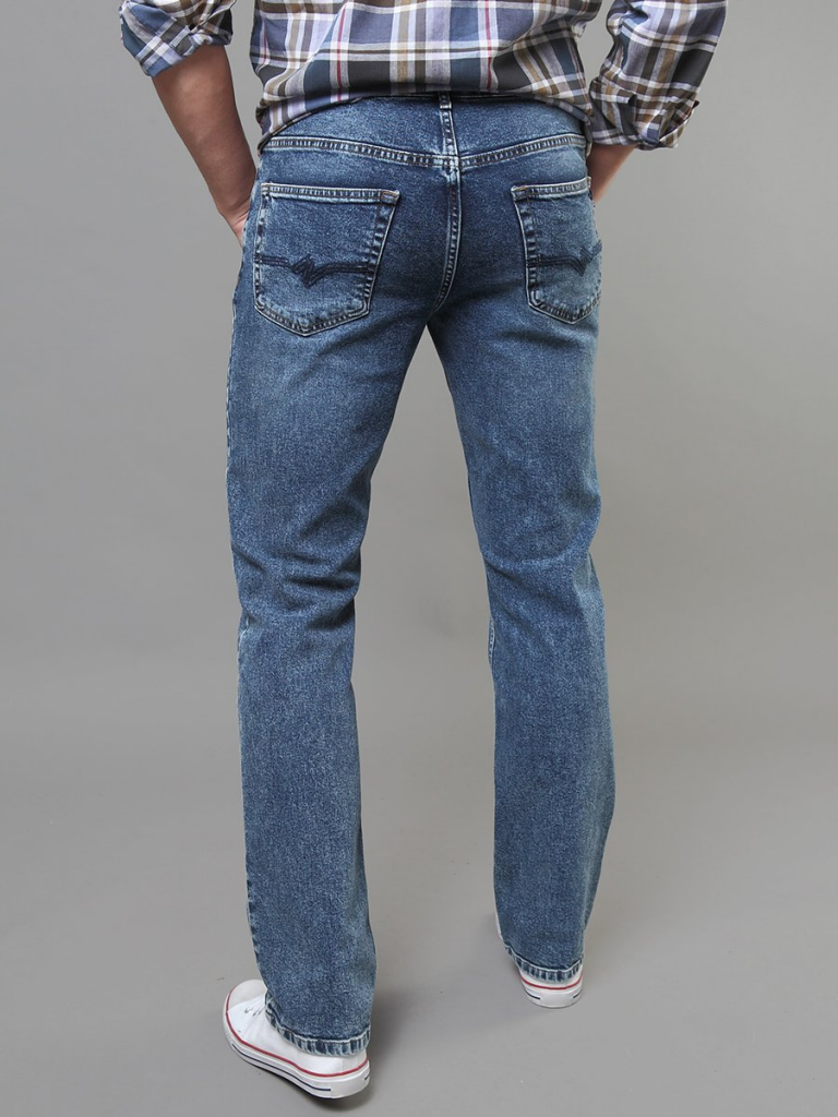 Мужские классические джинсы с пятью карманами. Посадка Regular fit (полуоблегающие по бедру), высокая талия, немного заужены к низу. Застежка на молнии. Выполнены из слабоэластичной ткани denim comfort stretch. Специальная средняя стирка "towel wash", мраморный эффект. Параметры указаны для размера 32. Длина внутреннего шва - 83 см.