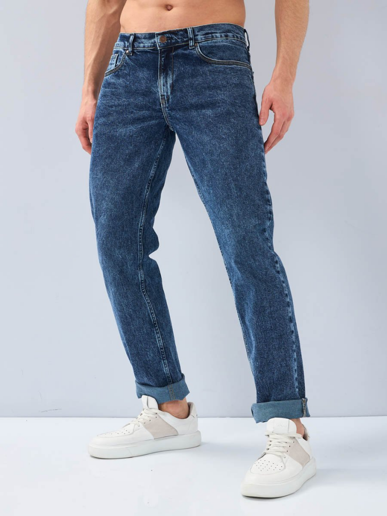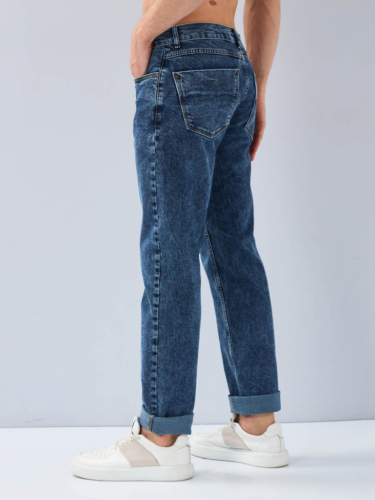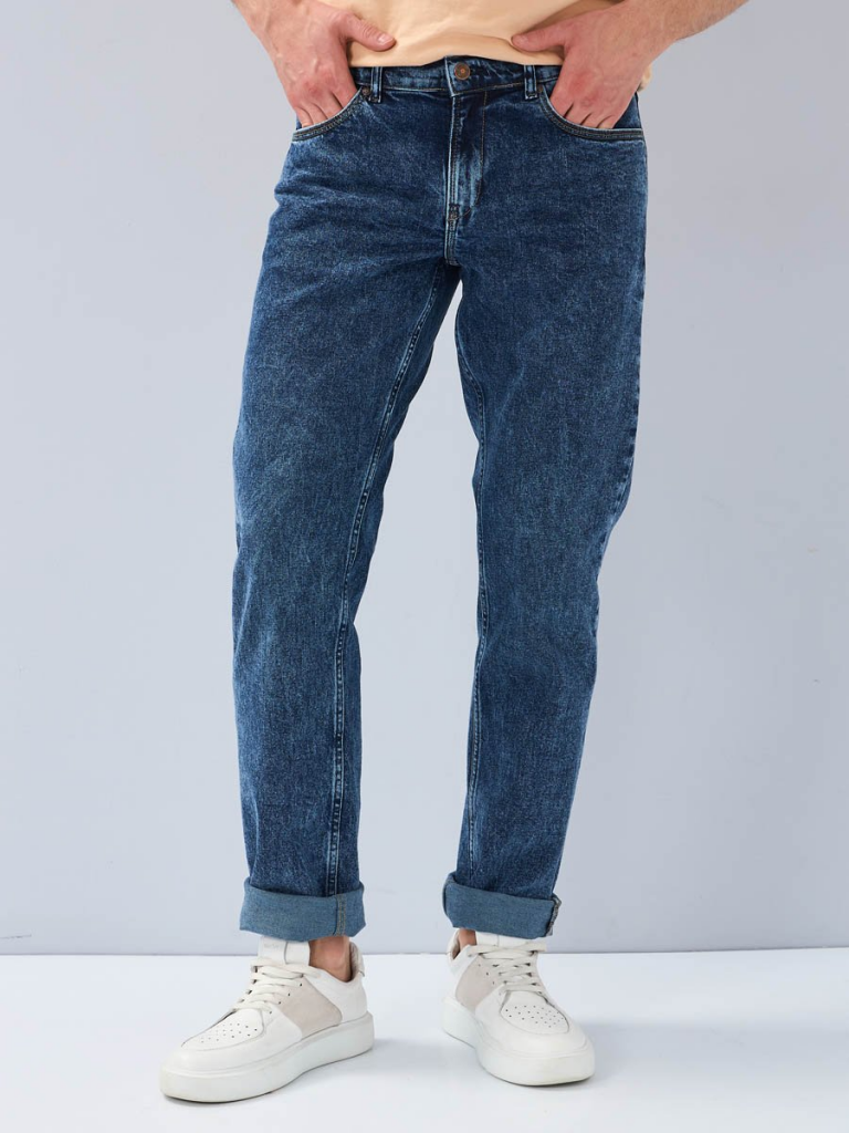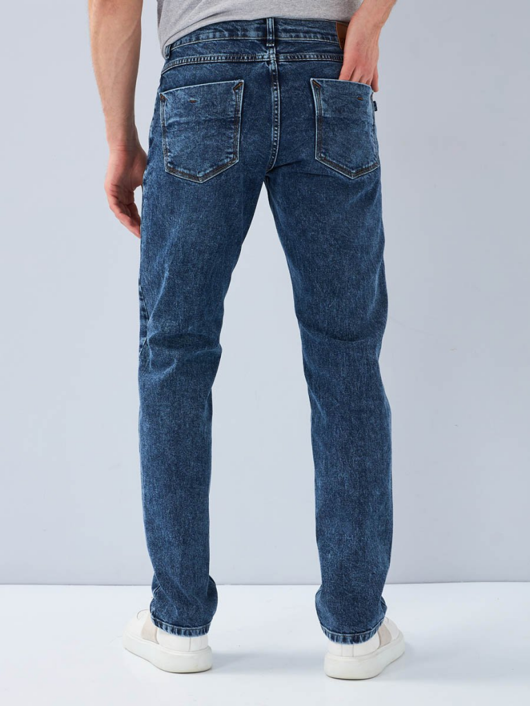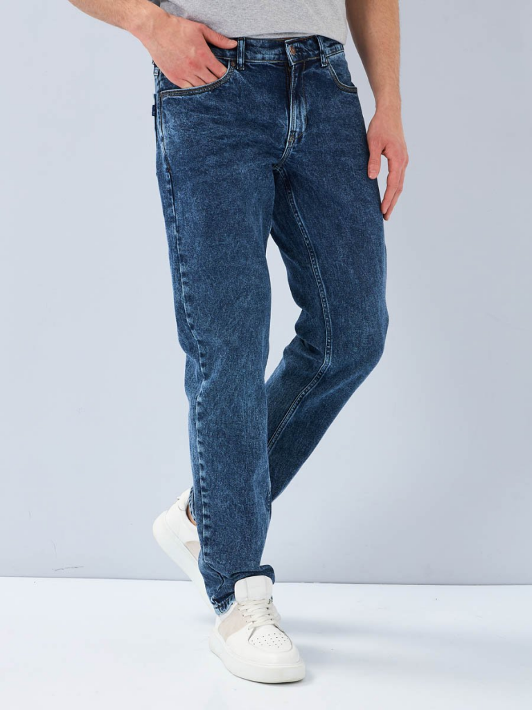 Мужские модные джинсы с пятью карманами, на части швов сделаны тройные отстрочки разными нитками, в качестве отделки использована двухцветная тесьма на часовом кармане, под поясом и на внутренней части пояса. Посадка Regular fit (полуоблегающие по бедру), низкая высота талии спереди и высокая сзади. Застежка на молнии. Зауженные по низу. Выполнены из слабоэластичной ткани denim comfort stretch. Специальная средняя стирка "towel wash", мраморный эффект.