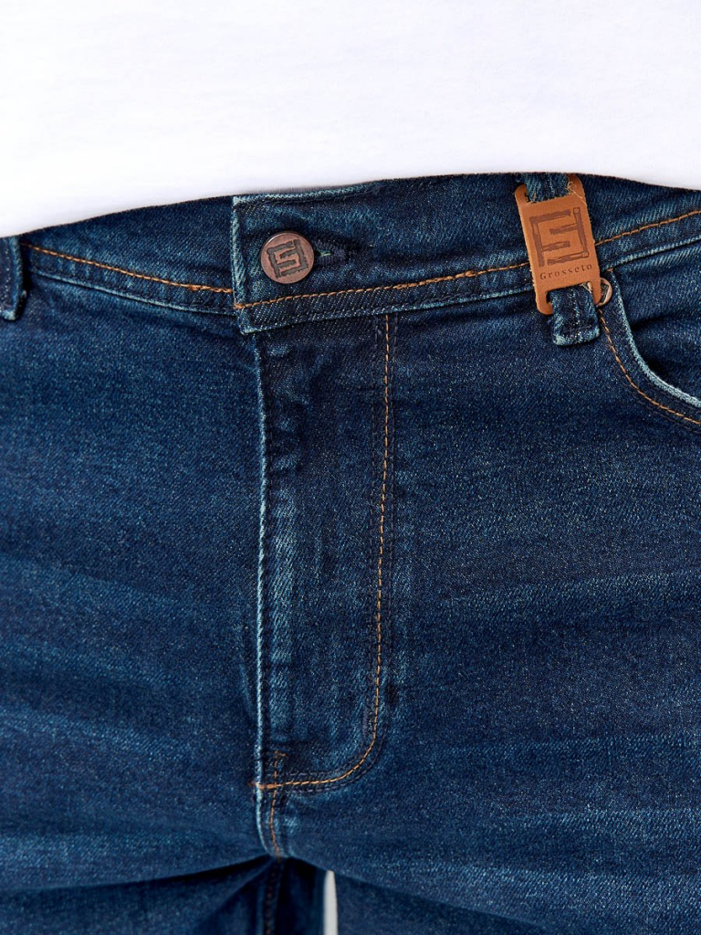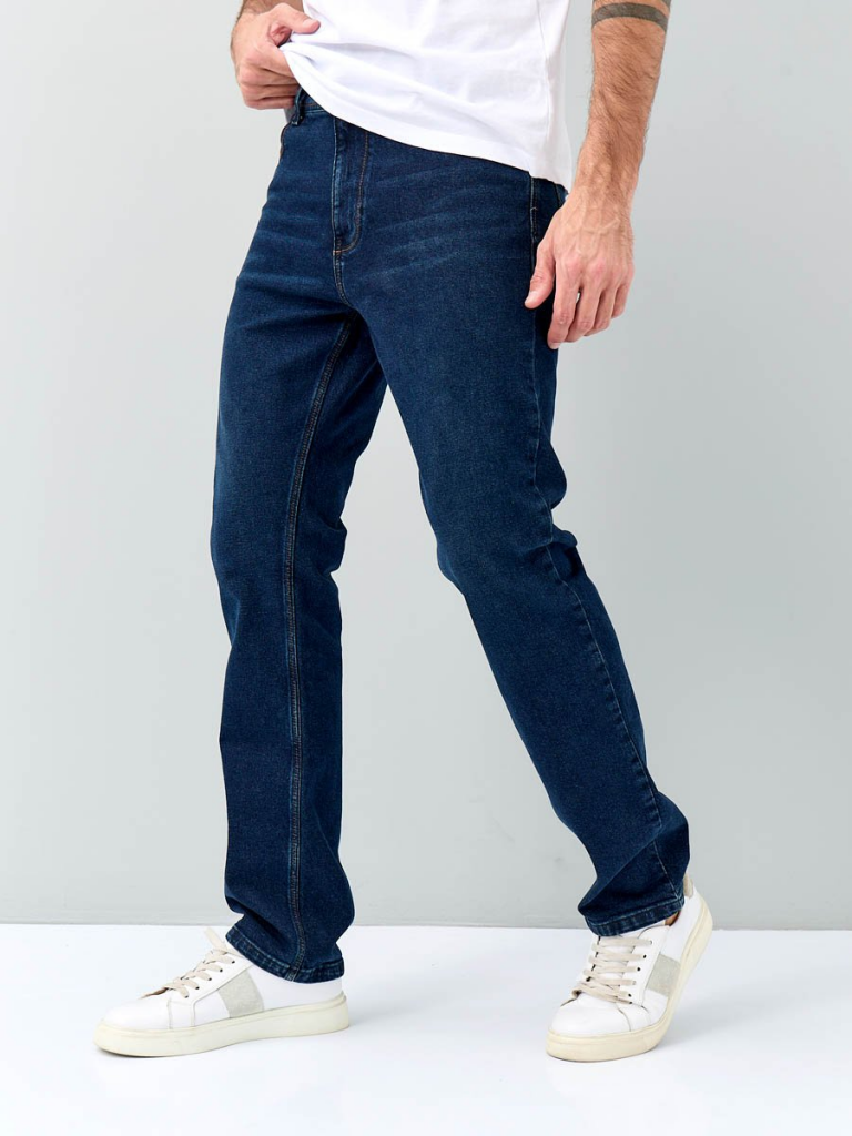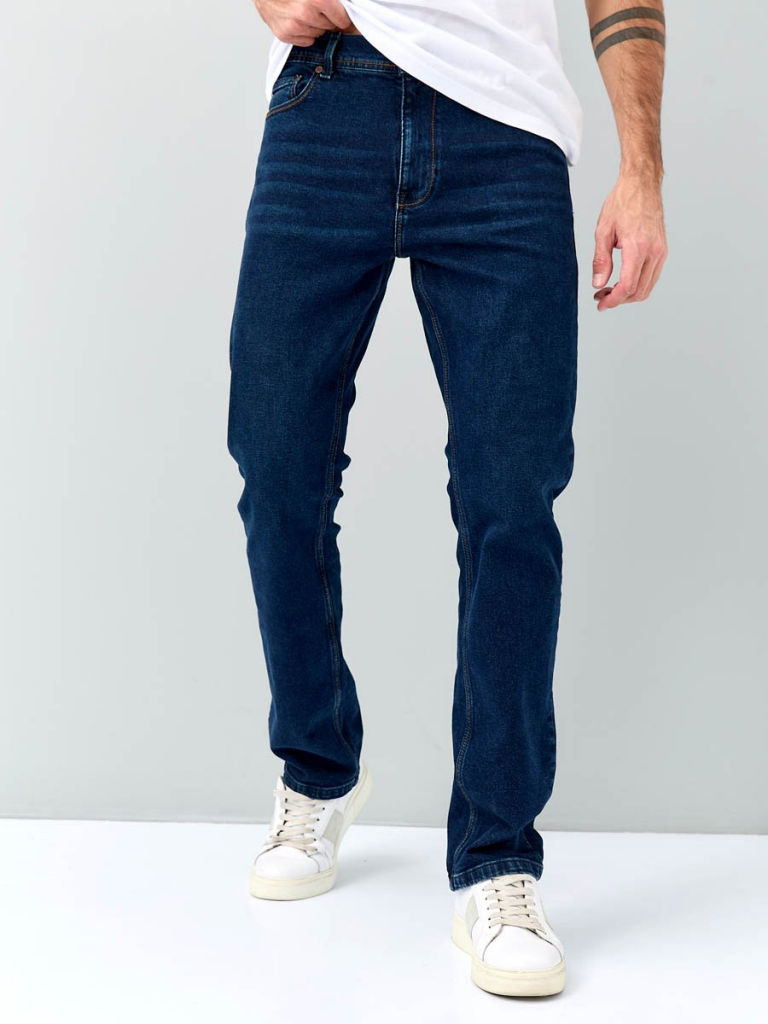 Мужские классические джинсы с пятью карманами. Посадка Regular fit (полуоблегающие по бедру), высокая талия. Застежка на молнии. Зауженные к низу. Выполнены из слабоэластичной ткани denim comfort stretch. Средняя стирка с потёртостями и "усами" спереди и потёртостями сзади. Параметры указаны для размера 32. Длина внутреннего шва - 83, 5 см.