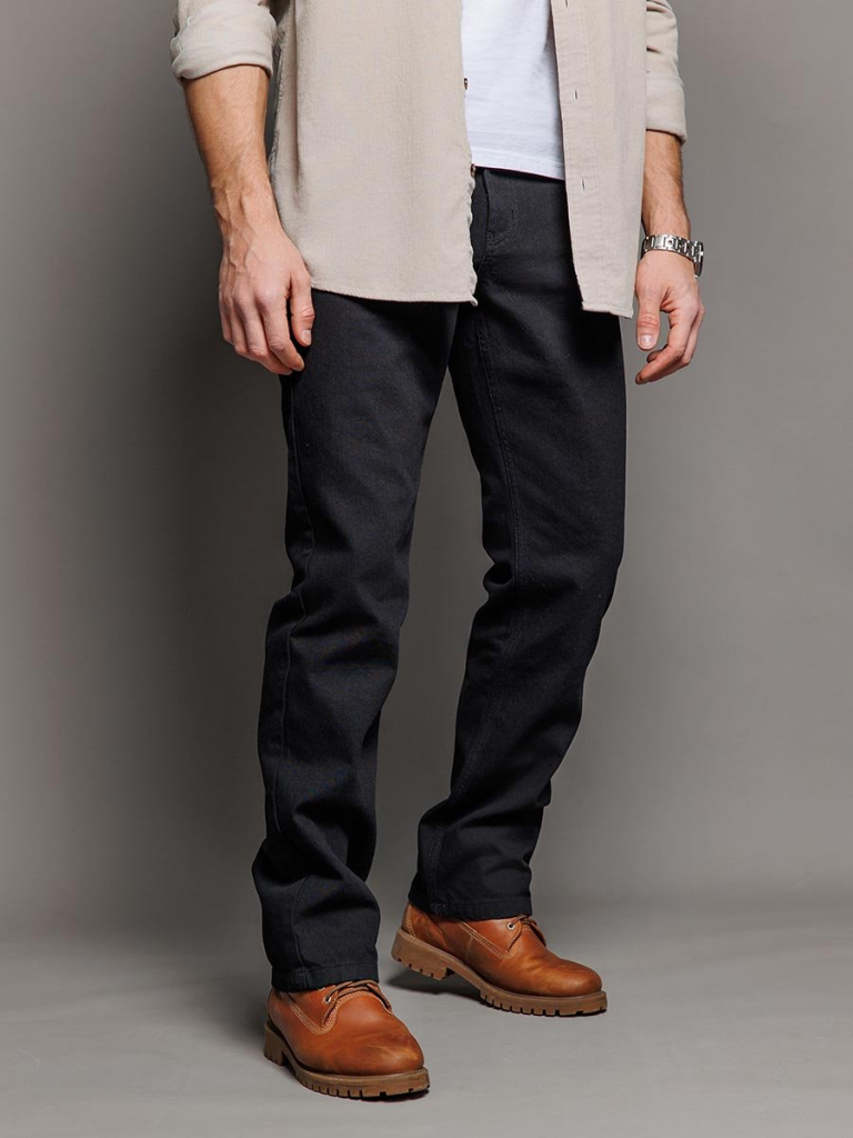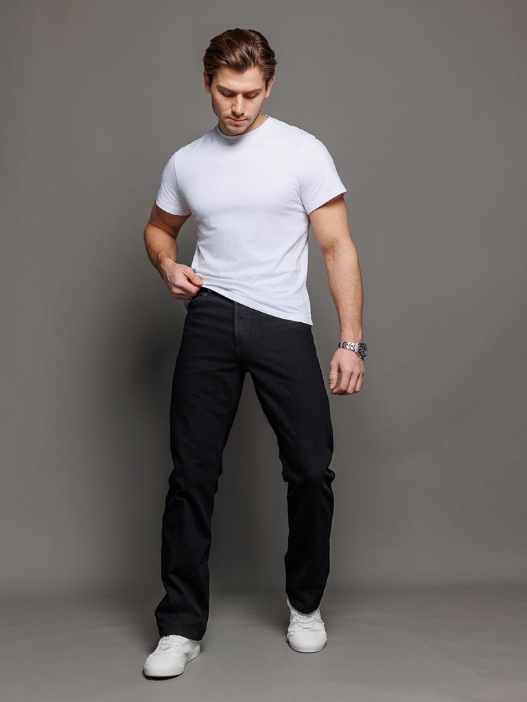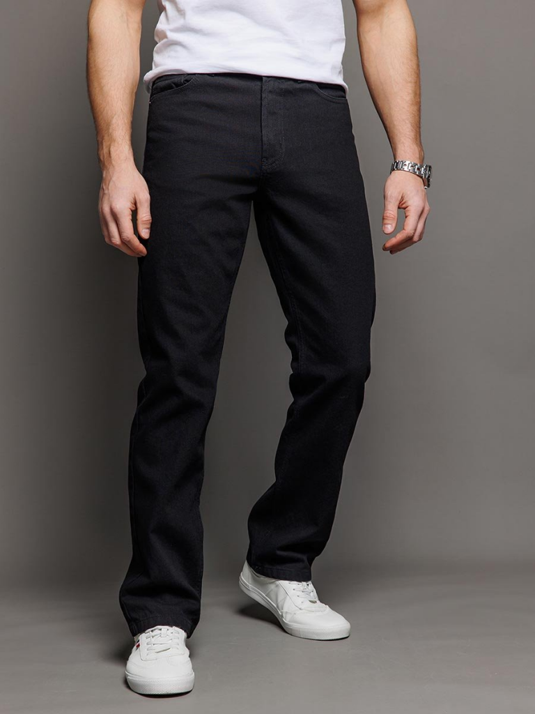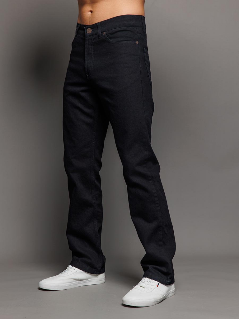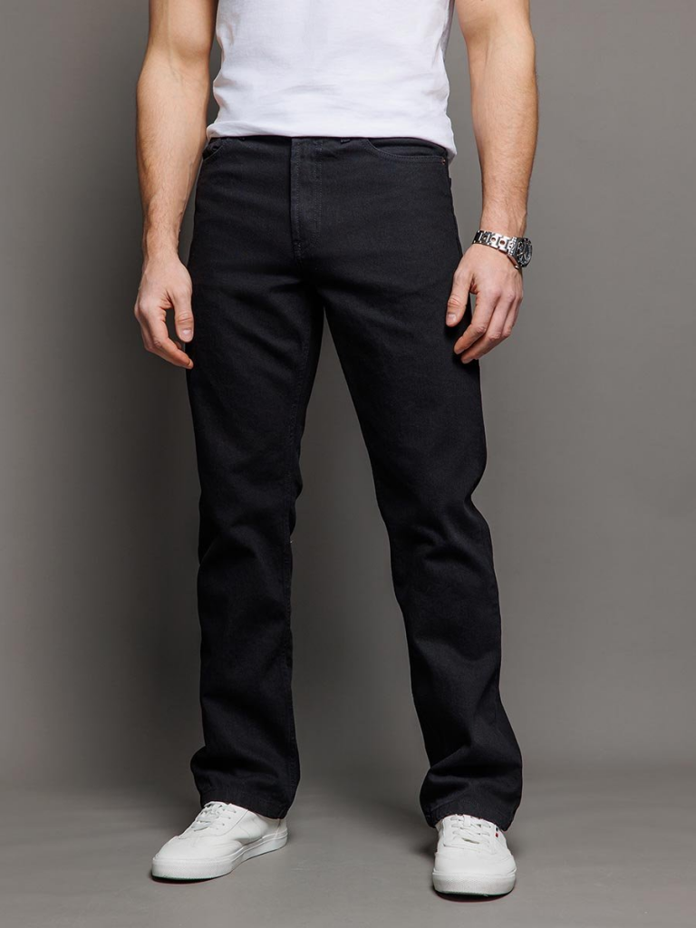 Мужские классические джинсы с пятью карманами. Посадка Regular fit (полуоблегающие по бедру), высокая талия. Застежка на молнии. Немного заужены в колене и по низу. Выполнены из слабоэластичной ткани denim comfort stretch средней плотности. Цвет ткани Black/Black (лицевая и изнаночная стороны ткани черные). Специальная темная стирка без потёртостей.