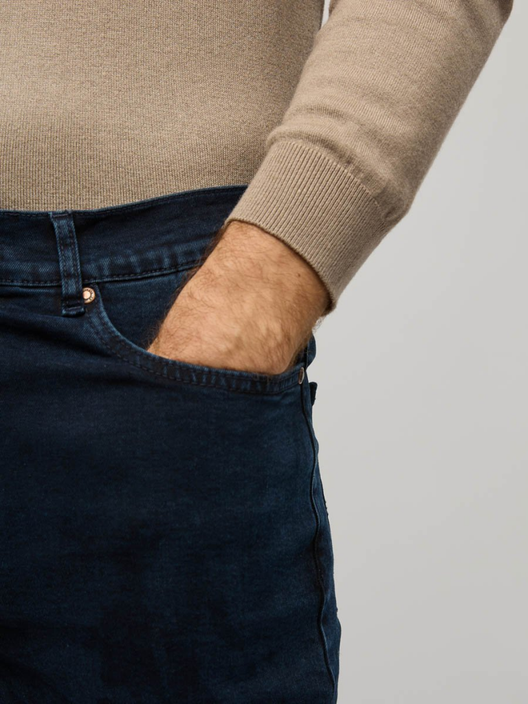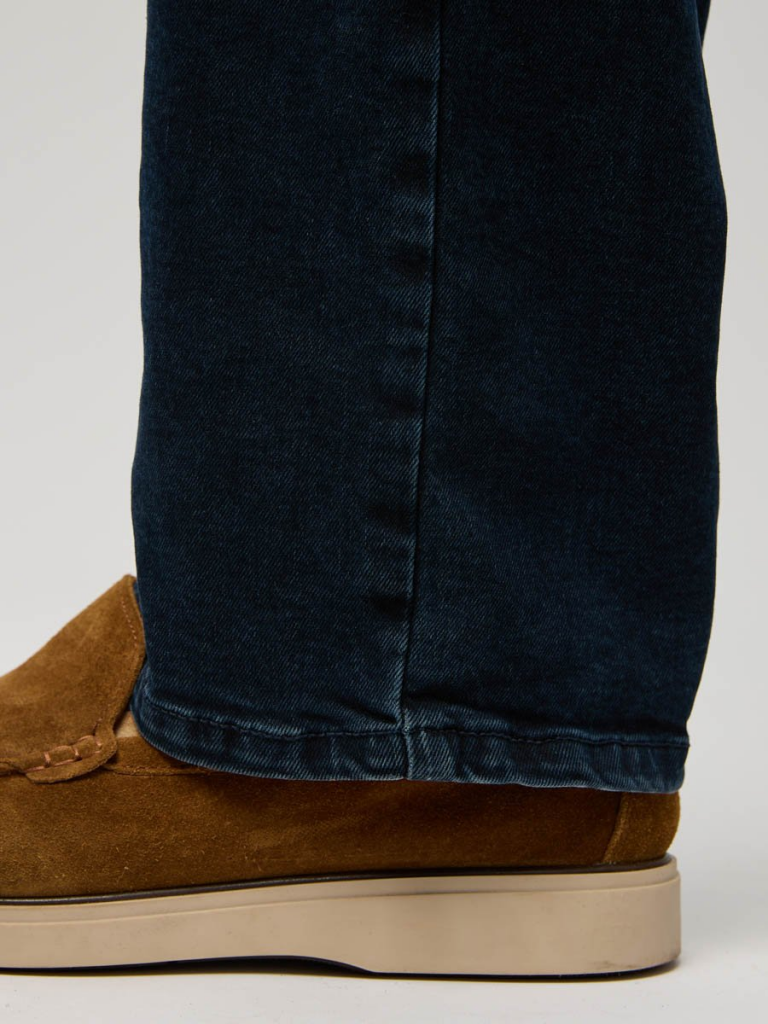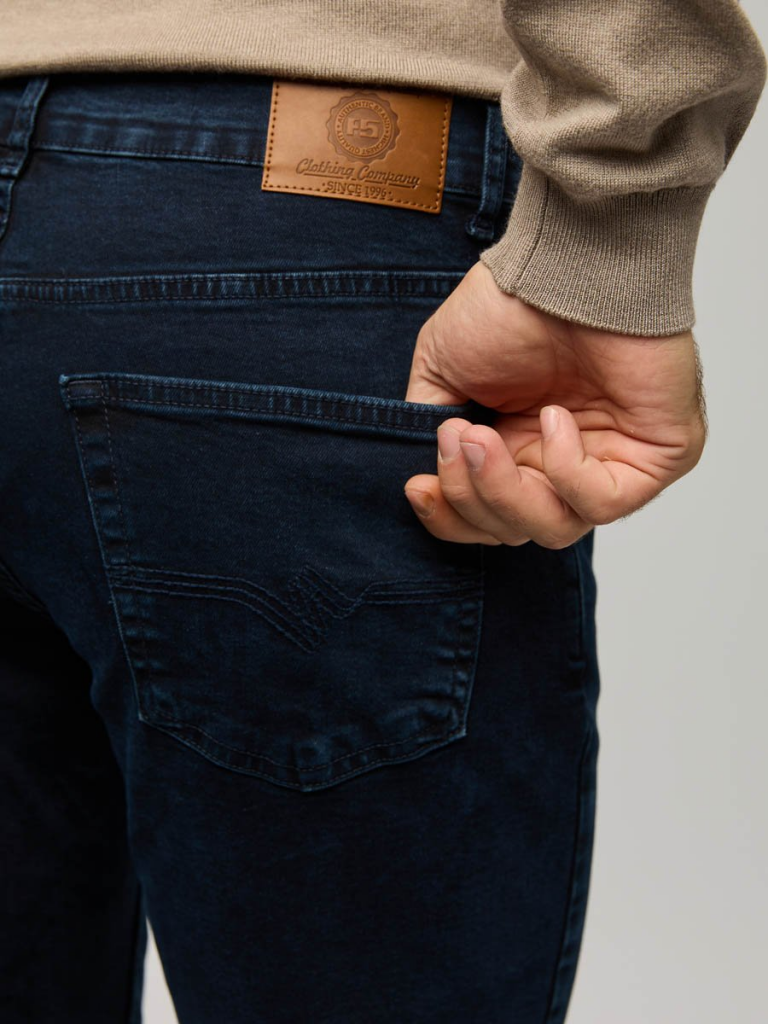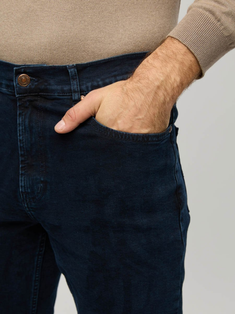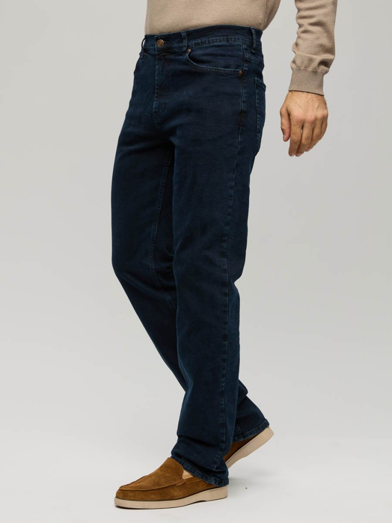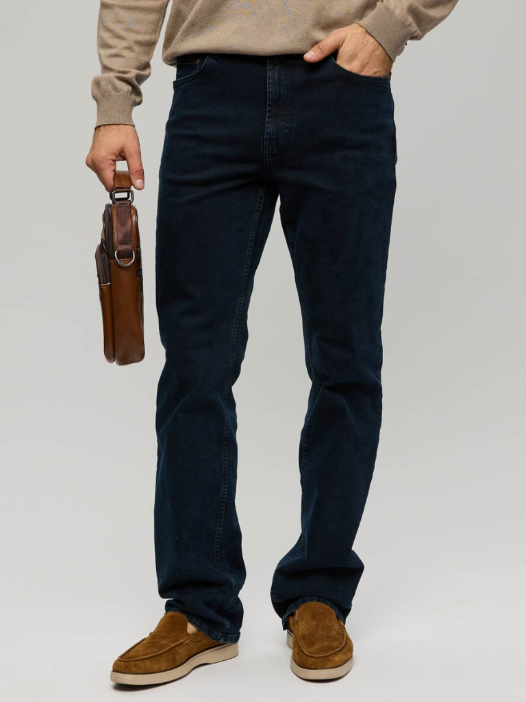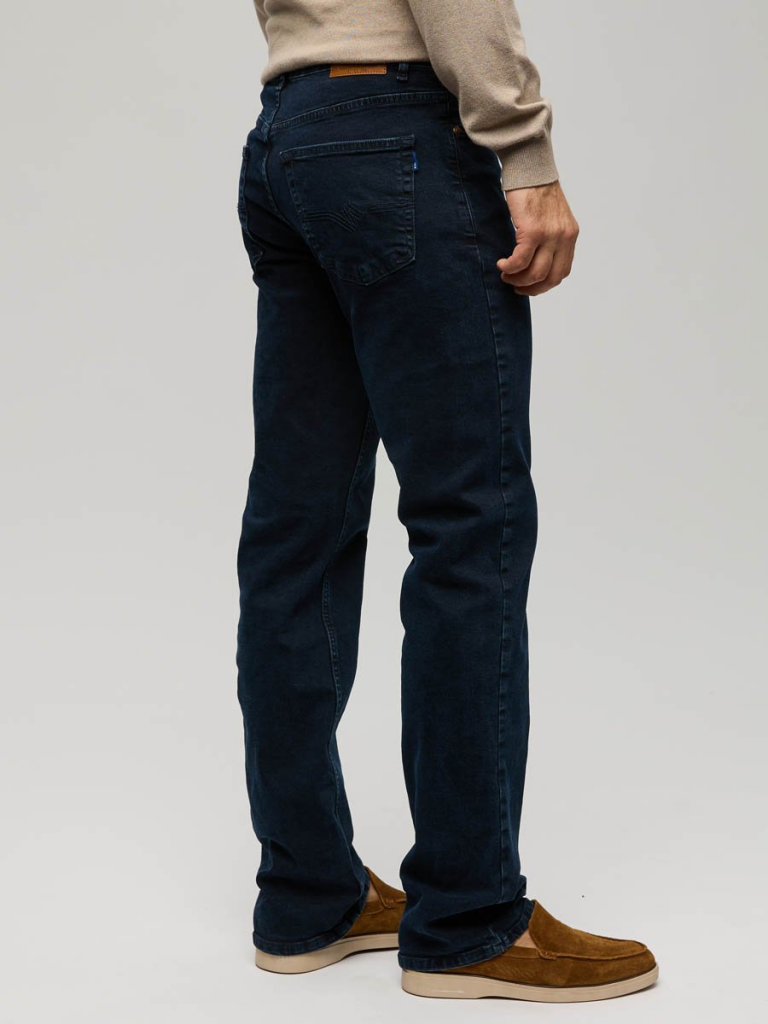 Мужские классические джинсы с пятью карманами. Посадка Regular fit (полуоблегающие по бедру), высокая талия, немного заужены к низу. Застежка на молнии. Выполнены из эластичной ткани denim stretch, цвет ткани Blue/Black(лицевая сторона ткани темно-синяя, изнаночная сторона- черная). Темная стирка со потёртостями только по швам.