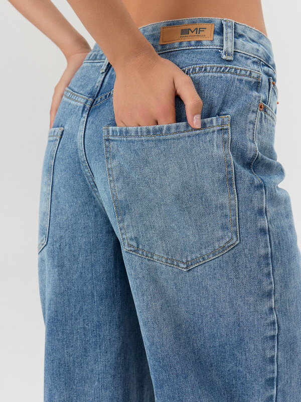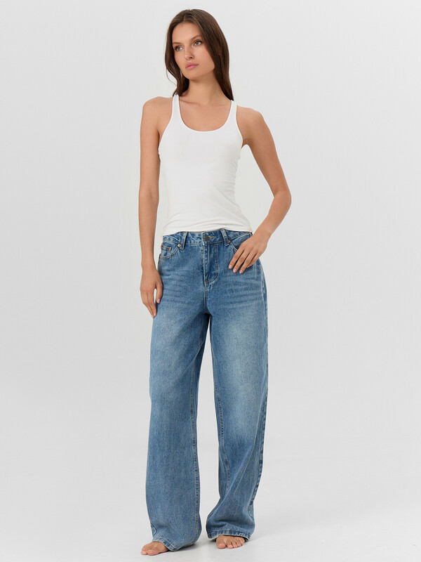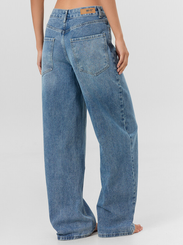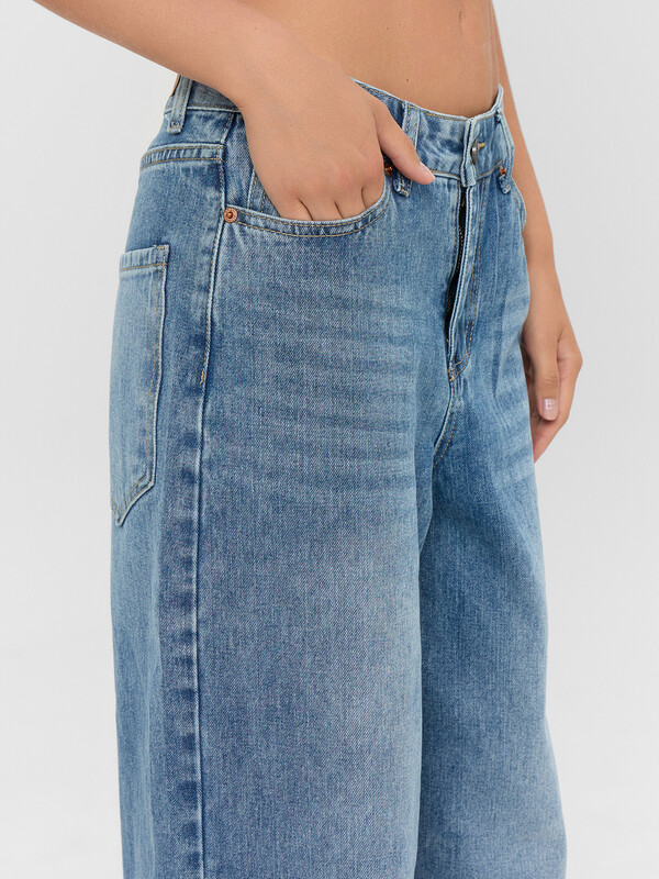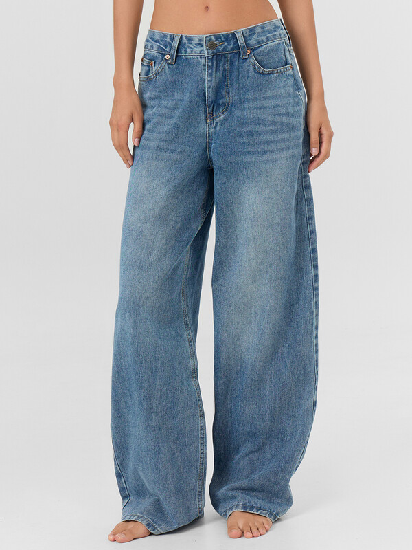 Синие джинсы широкого кроя — ваш идеальный спутник для повседневной жизни. Модель wide leg со средней посадкой мягко облегает талию и плавно расширяется от бедра, создавая элегантный прямой силуэт, который дарит полную свободу движений и визуально удлиняет ноги.