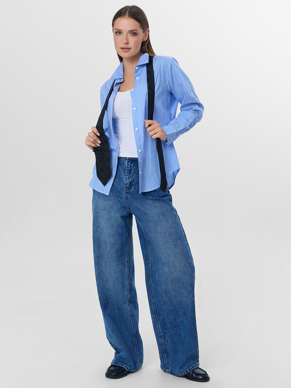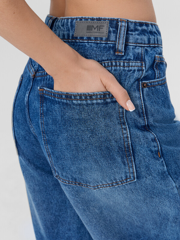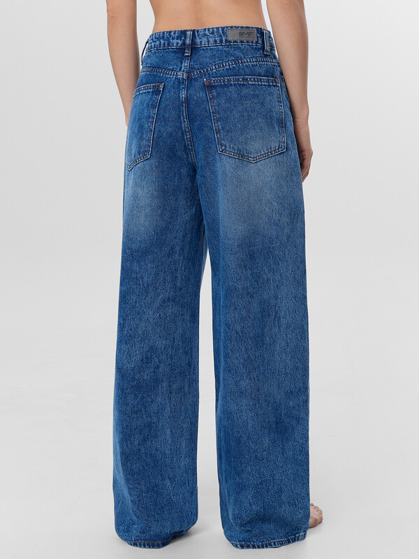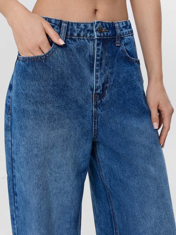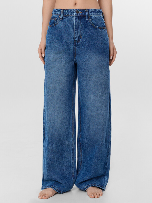 Синие женские джинсы — идеальная основа для современного расслабленного образа. Широкий крой и комфортная посадка обеспечивают полную свободу движений, визуально вытягивая силуэт, а средняя линия талии гарантирует универсальную и комфортную фиксацию.