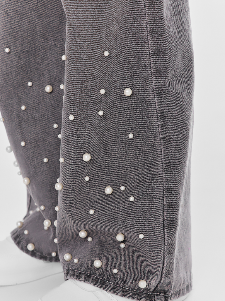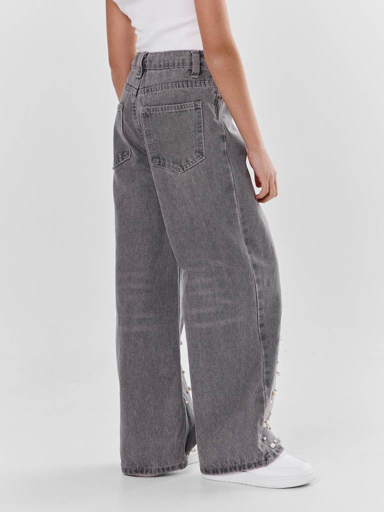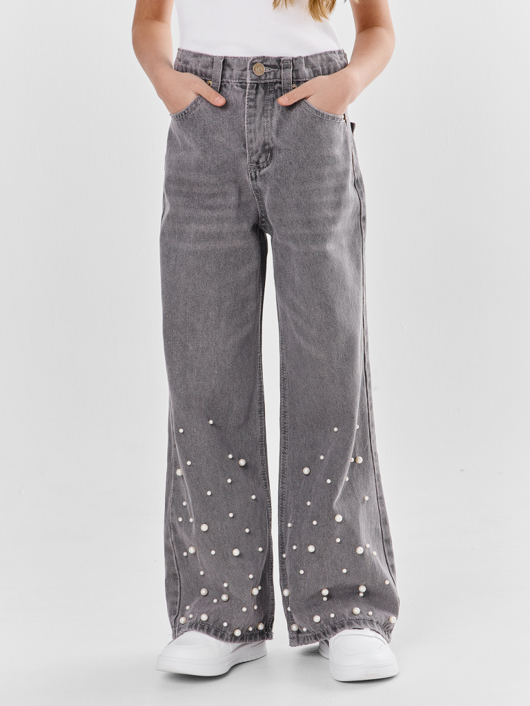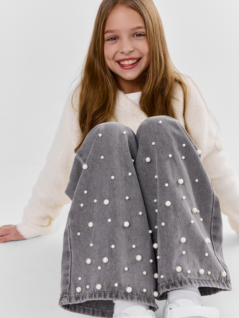 Джинсы для девочек в мягком сером цвете с эффектом светлой варки — модель свободного кроя wide leg с высокой посадкой. Такой силуэт делает образ более лёгким и современным. Главная деталь — бусины, рассыпанные по низу. Они добавляют игру света и текстуры, превращая обычные джинсы в нарядный, продуманный предмет гардероба.