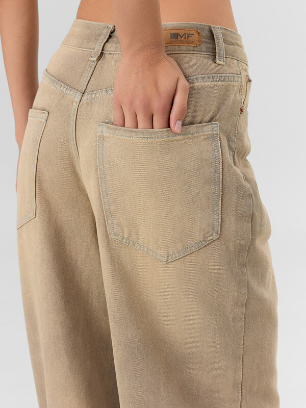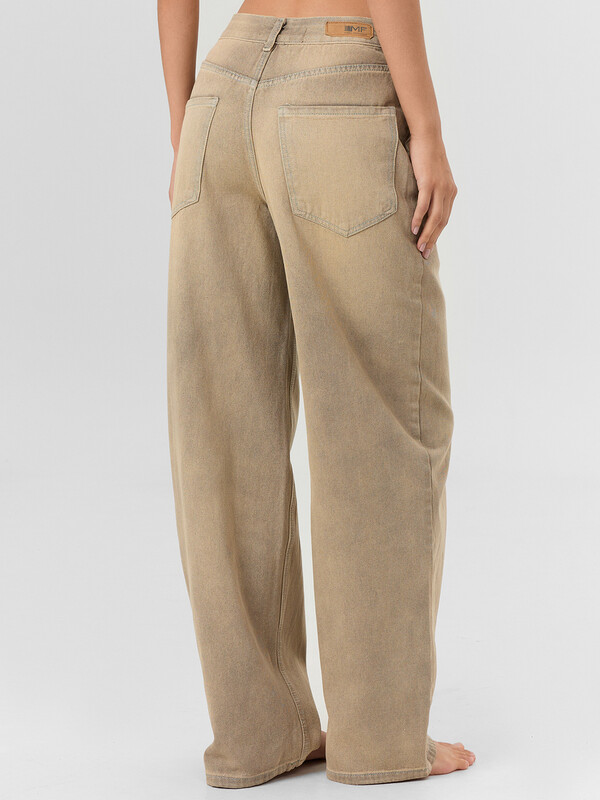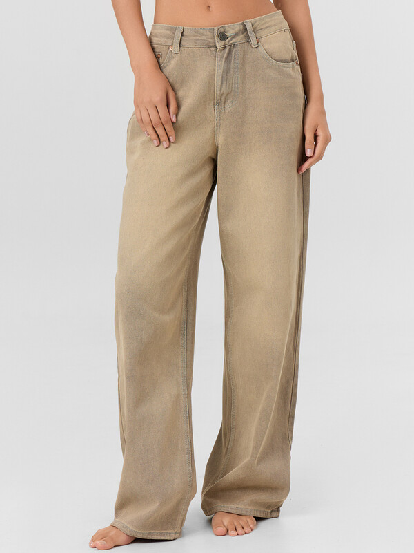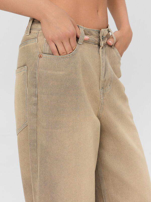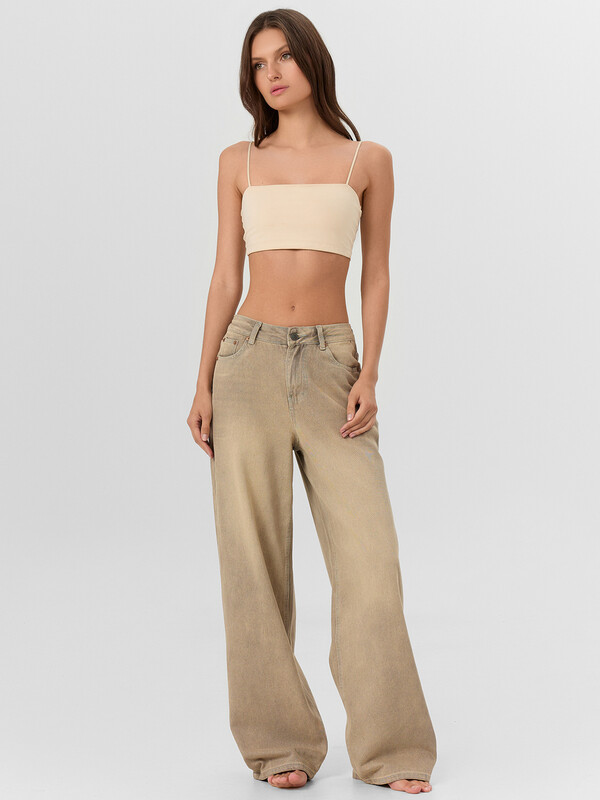 Бежевые джинсы с эффектом потертости — универсальная основа для создания стильных образов. Модель со средней посадкой и широким прямым кроем от бедра дарит максимальную свободу движений и формирует выразительный силуэт, который визуально удлинняет линию ног.