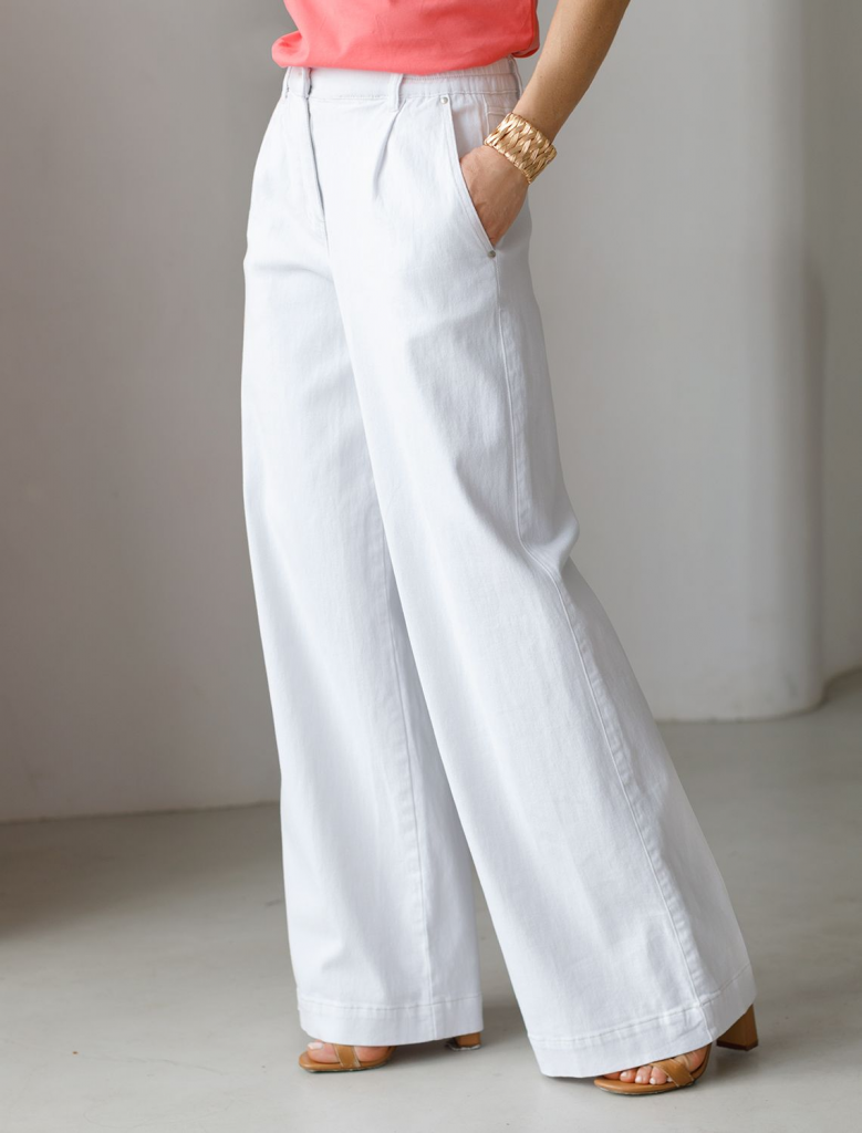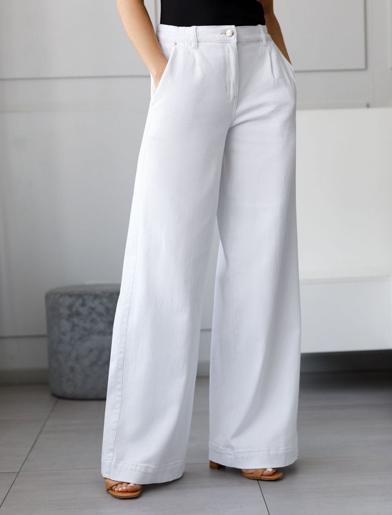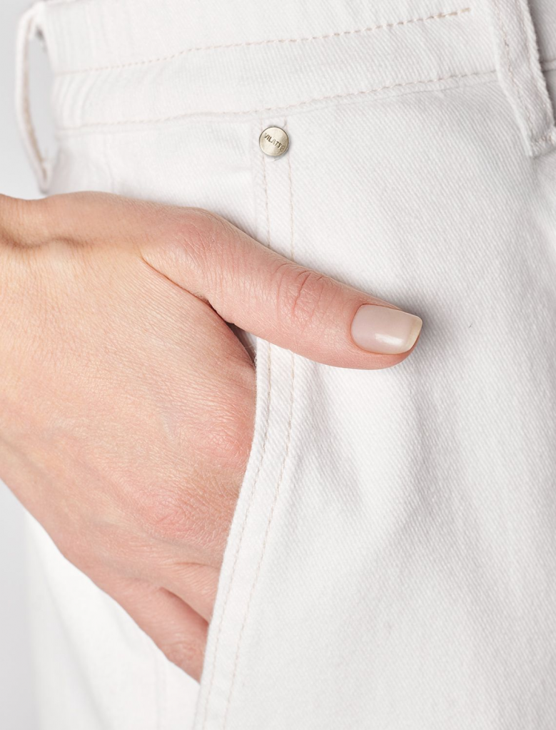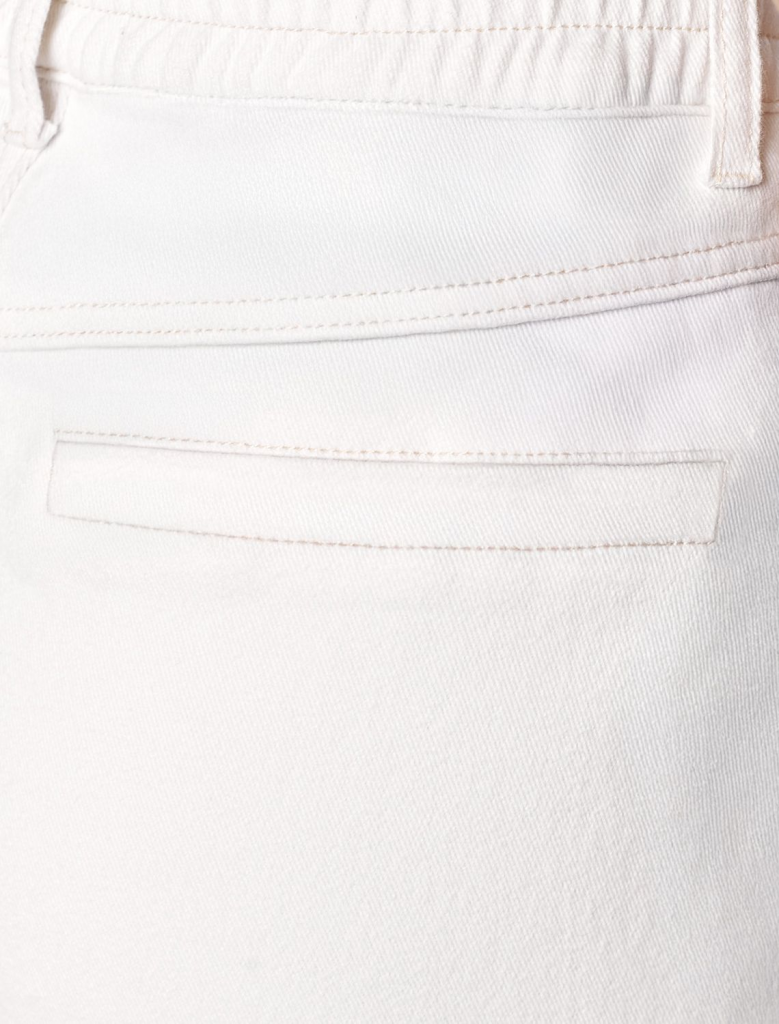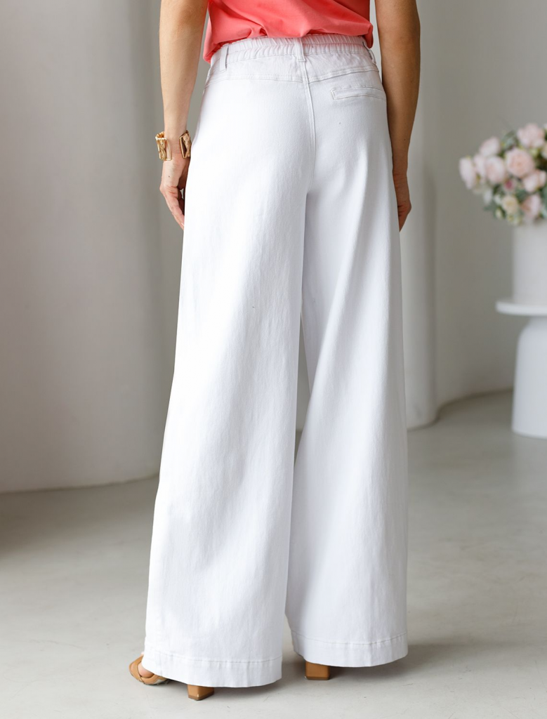 Джинсы выполнены из эластичного денима. Модель свободного кроя с карманами как у классических брюк дополнена эластичной резинкой на поясе сзади. Этот удобный элемент позволяет комфортно фиксировать изделие. При желании можно вставить ремень, в изделии предусмотрены петли по периметру пояса.