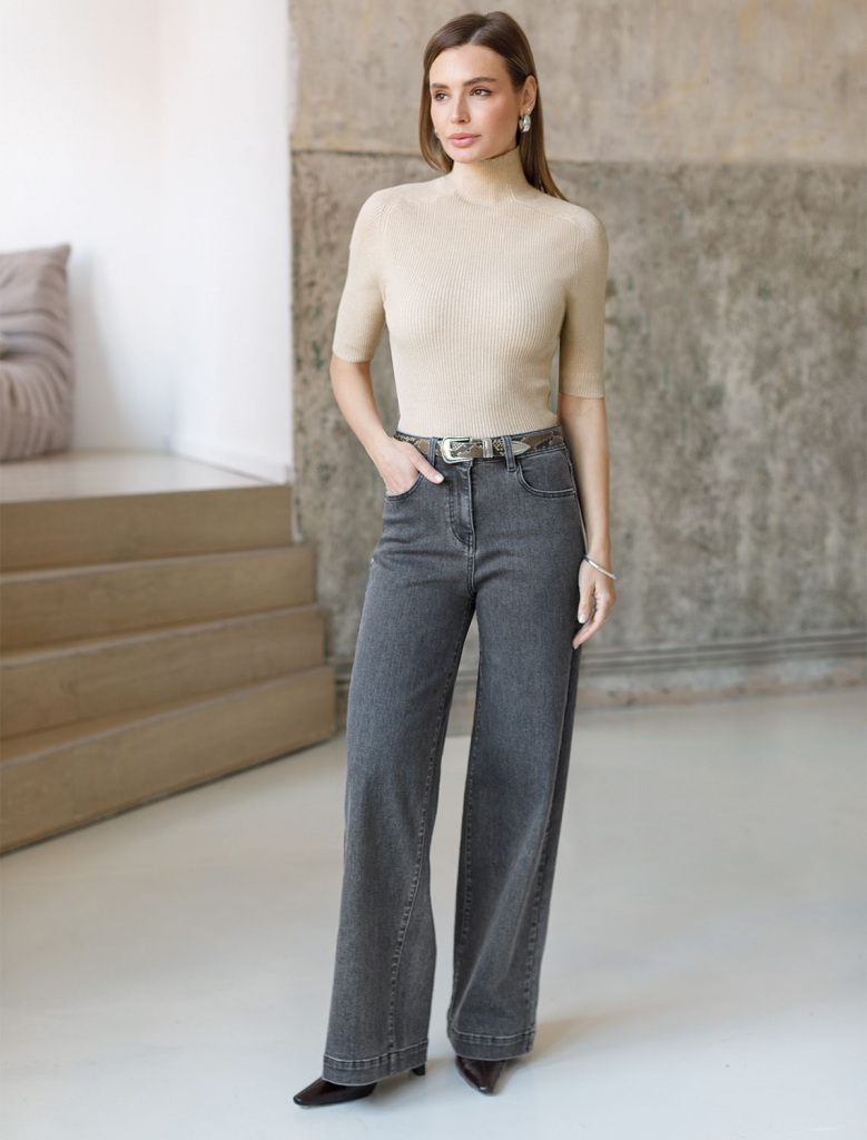 Стильные джинсы трубы серого цвета прямого кроя выполнены из эластичного денима, что делает их особенно удобными для повседневной носки. Декоративная стирка добавляет современный акцент и подчеркивает современный дизайн. Джинсы правильного кроя визуально вытягивают силуэт, благодаря эластану в составе аккуратно садятся на любую фигуру, подчеркивая достоинства, а обеспечивают максимальный комфорт в течение дня, не сковывая движения. Широкая размерная линейка подходит для разных типов фигур: свободные джинсы комфортны как для обладательниц пышных форм, так и для худеньких. Вы сможете подабрать джинсы на низкий или высокий рост. Плотные джинсы идеально держат форму даже при активном движении и не вытягиваются после долгой носки. Качественная фурнитура, практичные карманы и контрастная строчка делают эти джинсы премиальными. Широкий подгиб добавляет актуальности — такой тренд отлично сочетается как с обувью на каблуке, так и на плоском ходу. Благодаря универсальному дизайну джинсы легко комбинируется с разными