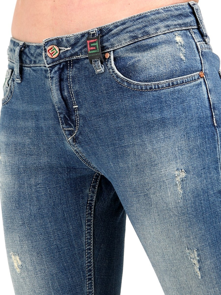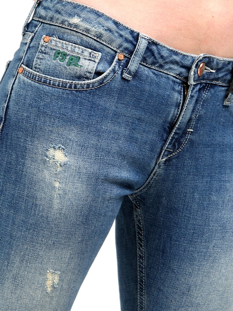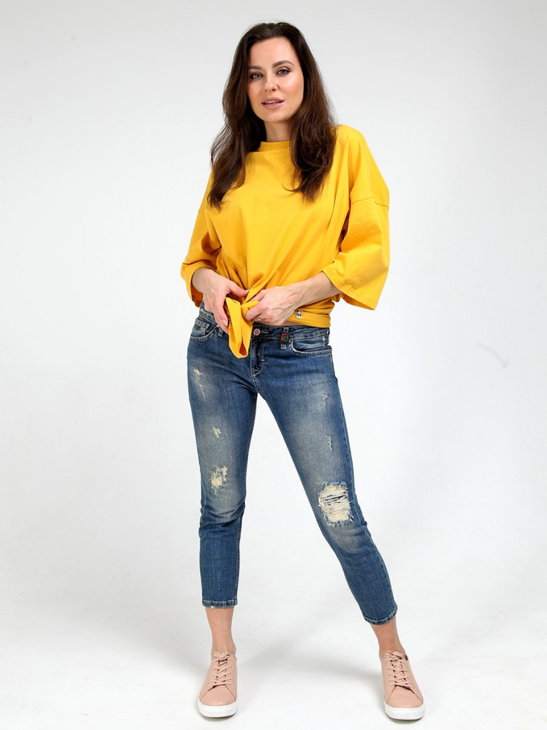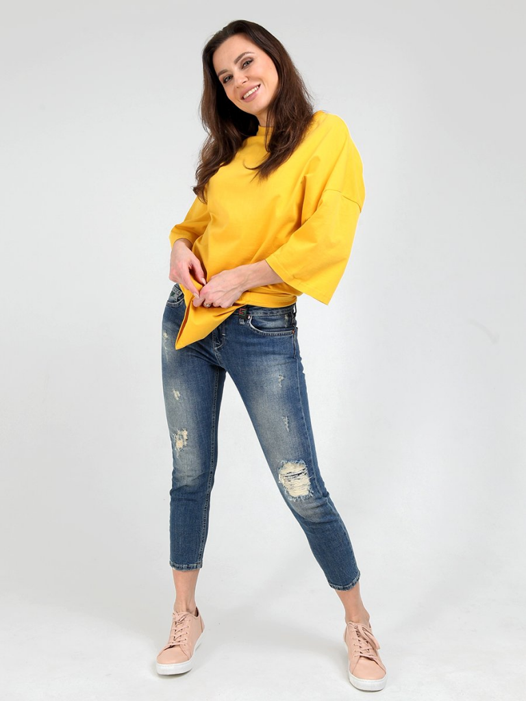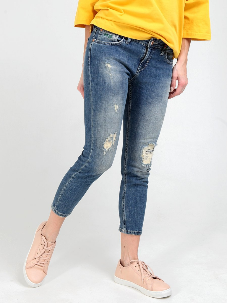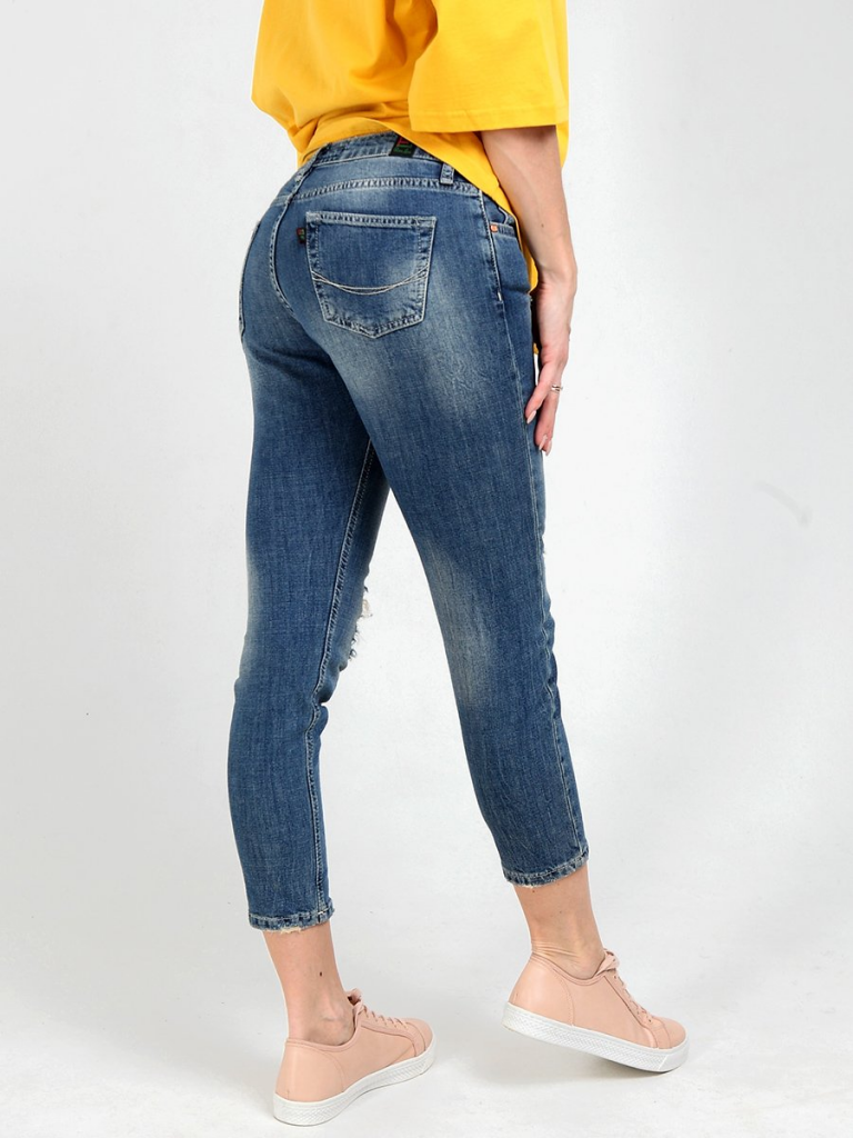Женские модные джинсы с пятью карманами. Посадка Skinny boyfriend fit, свободные в бедре и зауженные книзу, укороченные (внутренний шов - 67 см). Для улучшения посадки сделан подкройной пояс из 2-х частей. Застежка на молнию. Средняя посадка по талии спереди и высокая сзади. Оригинальная средняя стирка с дополнительным оттенком (тинт), с потёртостями и заломами. Спереди несколько растрепанных дырок, создающих модный эффект поношенности. Выполнены из слабоэластичной ткани denim comfort stretch. Модная фурнитура ограниченной серии. Параметры указаны для размера 28.