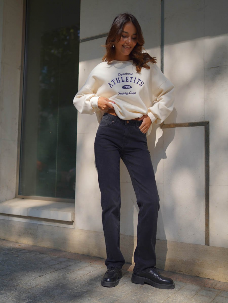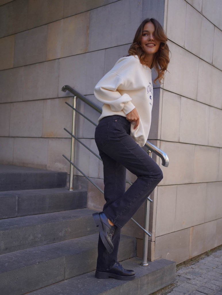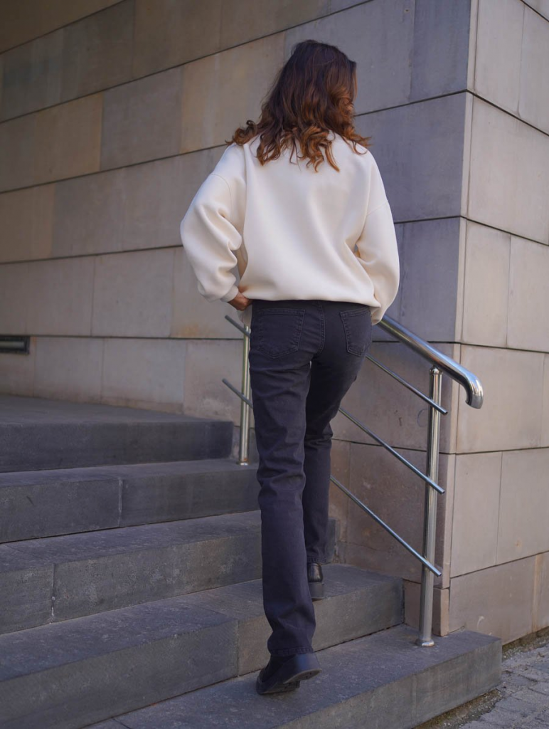 Женские классические джинсы с пятью карманами. Посадка Regular fit (полуоблегающие по бедру). Для улучшения посадки по талии сделан подкройной пояс из 2-х частей. Средняя высота талии спереди и высокая сзади. Застежка на молнии. Немного зауженные к низу. Выполнены из слабоэластичной ткани denim comfort stretch, цвет ткани Black/Black (лицевая и изнаночная стороны ткани черные). Средняя стирка с потертостями спереди и сзади. Параметры указаны для размера 28. Длина внутреннего шва - 81, 5 см.