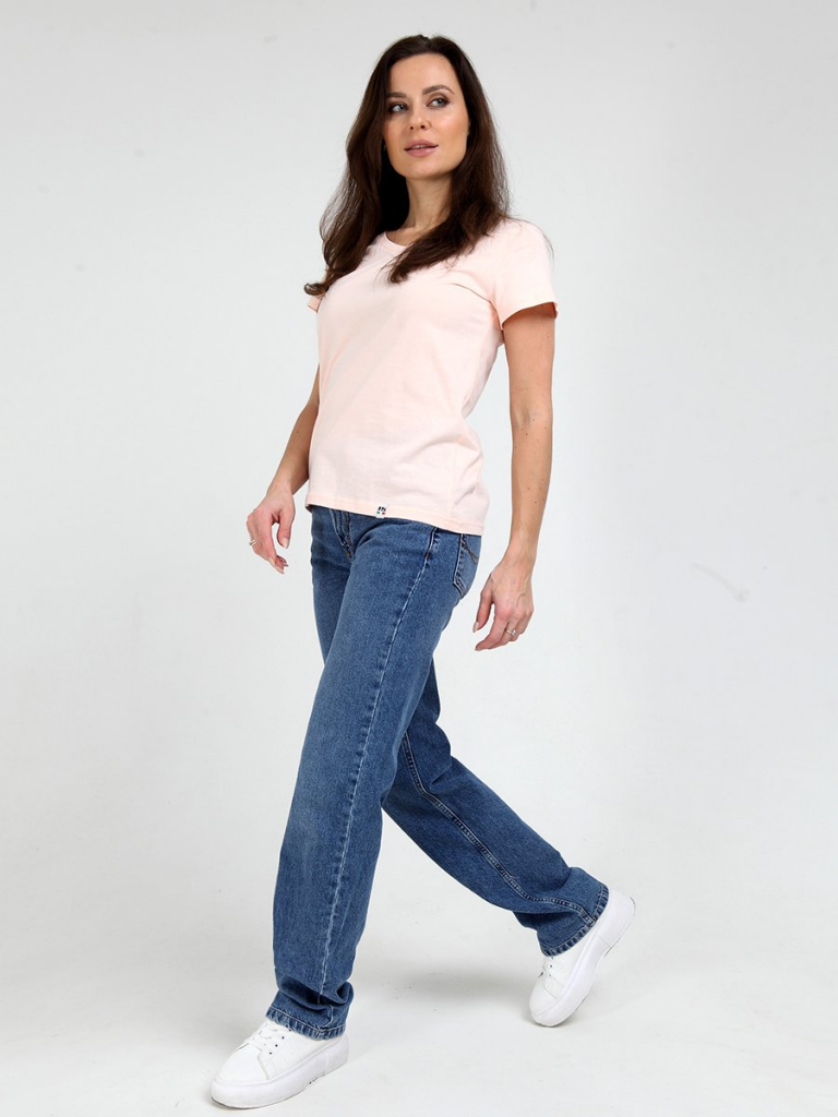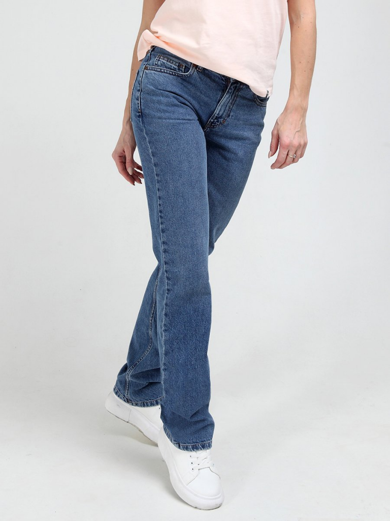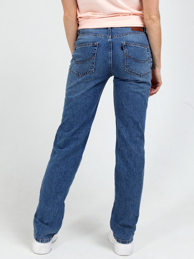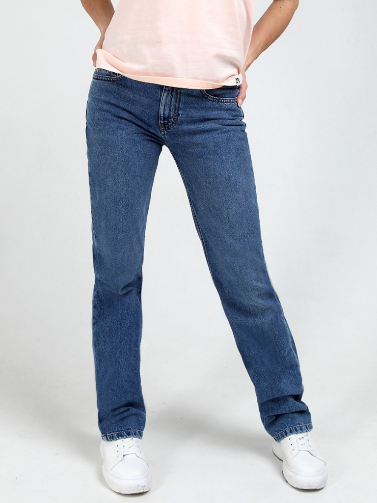 Женские классические джинсы с пятью карманами. Посадка Comfort fit (свободные по бедру). Средняя высота талии спереди и умеренно-высокая сзади. Застежка на молнии. Свободные по всей длине штанины, немного зауженные к низу. Выполнены из качественной ткани denim 100% хлопок. Светлая стирка с потёртостями и "усами" спереди и потёртостями сзади. Параметры указаны для размера 28. Длина внутреннего шва - 85 см.
