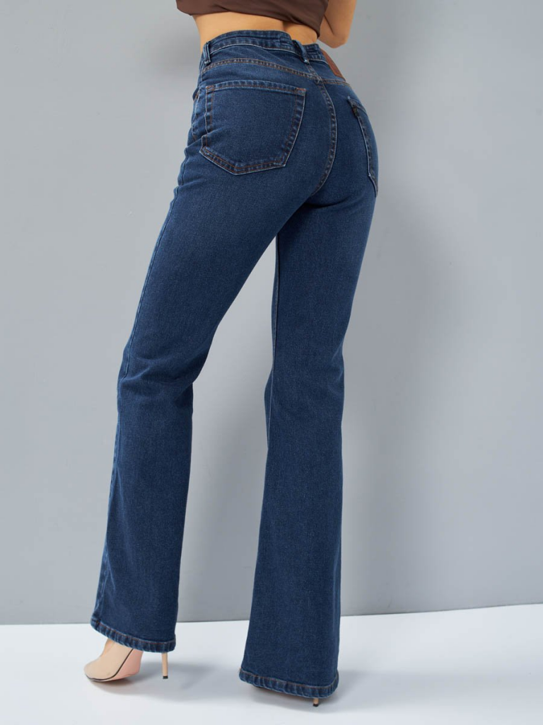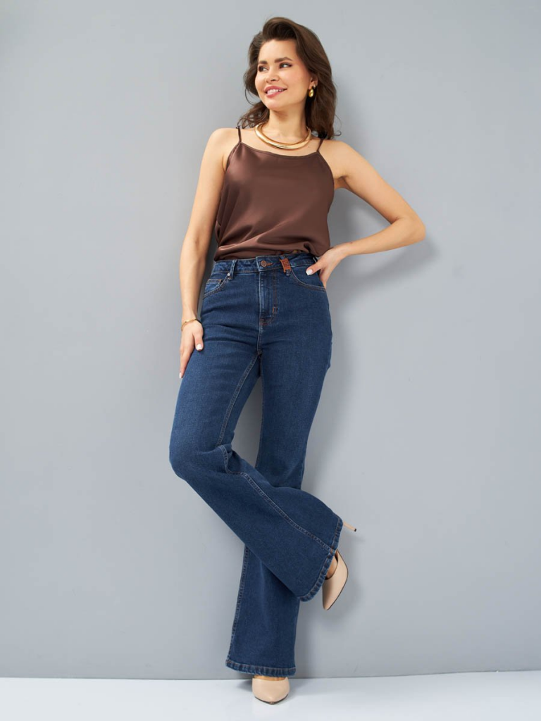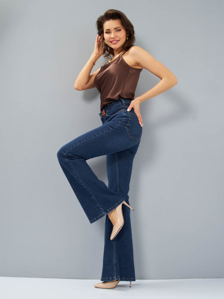 Женские джинсы с пятью карманами. Посадка Slim flare fit (облегающие по бедру и расклешенные от колена), высокая талия. Для улучшения посадки по талии сделан подкройной пояс из 2-х частей. Застежка на молнии. Выполнены из слабоэластичной ткани denim stretch, Средняя стирка со слабовыраженными потёртостями спереди и сзади.