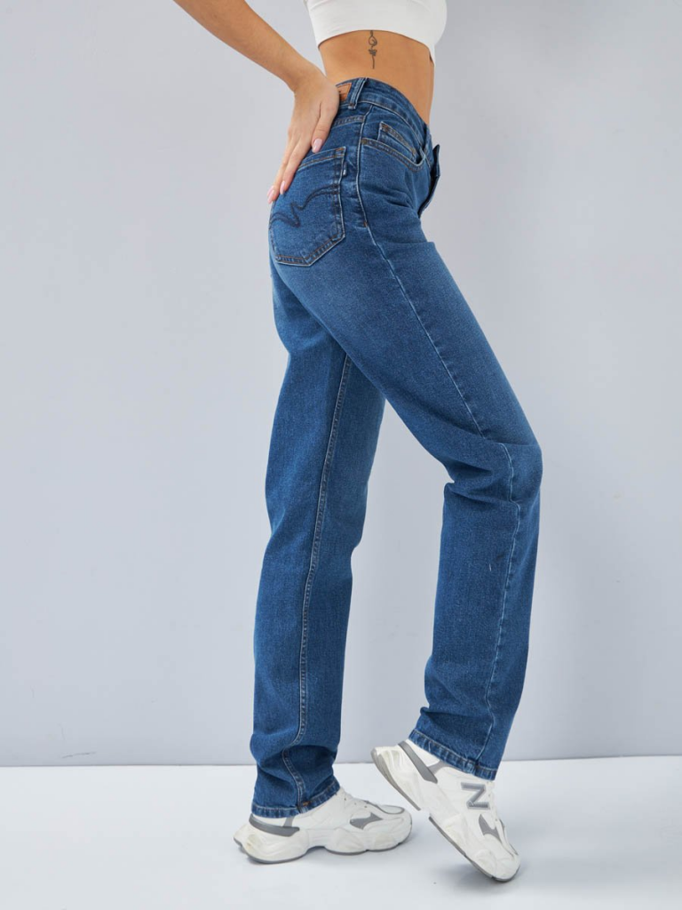 Женские классические джинсы с пятью карманами. Посадка Comfort fit (свободные по бедру). Специально завышенная талия. Для улучшения посадки по талии сделан подкройной пояс из 2-х частей. Застежка на молнии. Зауженные к низу. Выполнены из слабоэластичной ткани denim stretch. Средняя стирка со слабовыраженными потёртостями и "усами" спереди и потёртостями сзади. Параметры указаны для размера 28. Длина внутреннего шва - 83 см.