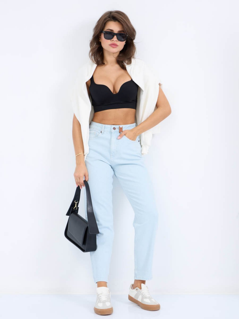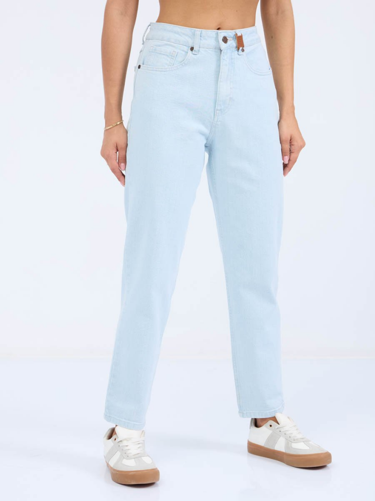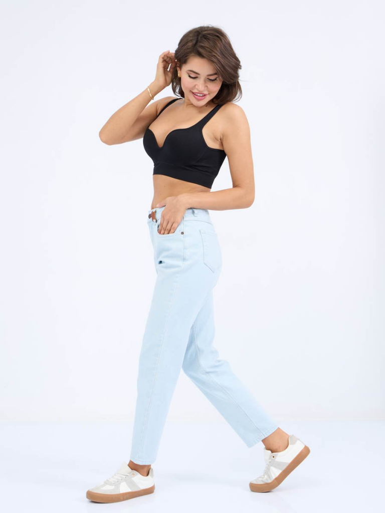 Женские модные джинсы с пятью карманами. Посадка Mom fit (высокая талия), свободные в бедре и зауженные к низу, укороченной длины. Застежка на молнию. Выполнены из слабоэластичной ткани denim comfort stretch. Классическая светлая стирка "stone wash"с отбеливанием.
