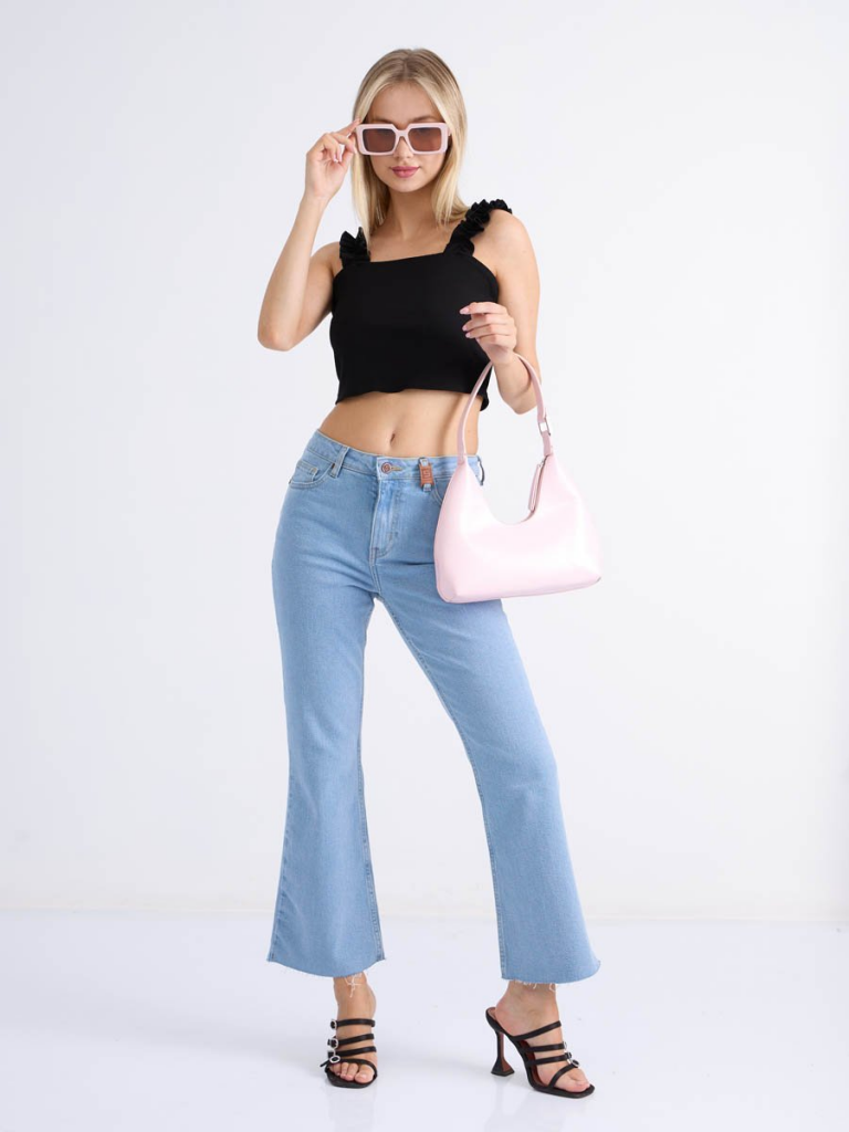 Женские джинсы с пятью карманами. Посадка Flare fit (полуоблегающие по бедру и расклешенные от колена), высокая талия, укороченной длины. Для улучшения посадки по талии сделан подкройной пояс из 2-х частей. Застежка на молнии. Выполнены из слабоэластичной ткани denim stretch. Классическая светлая стирка "stone wash"с отбеливанием.
