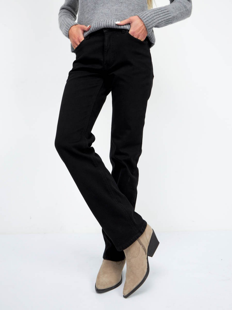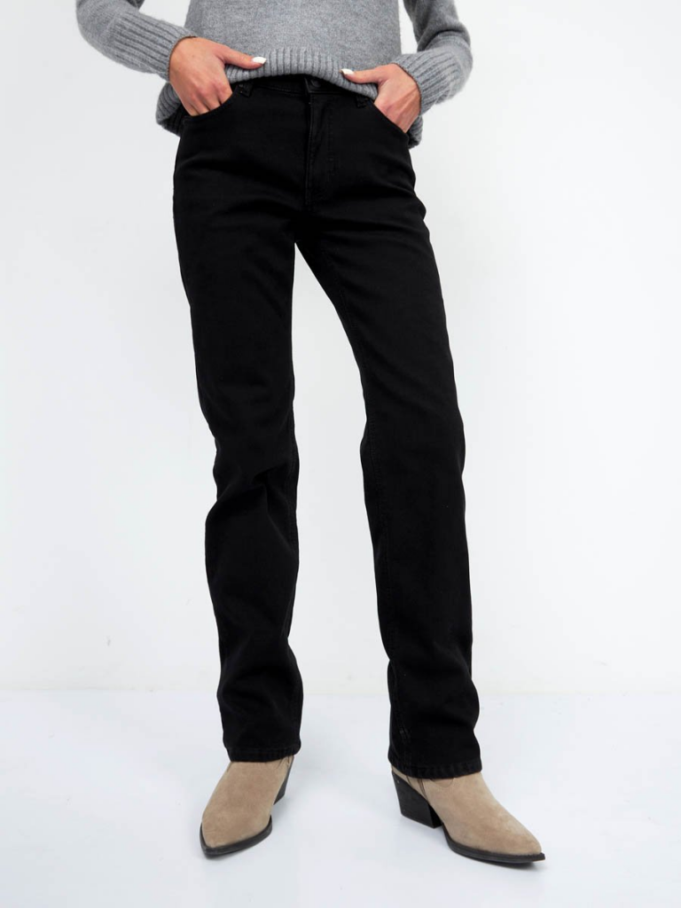 Женские классические утепленные джинсы с пятью карманами. Посадка Regular fit (полуоблегающие по бедру). Для улучшения посадки по талии сделан подкройной пояс из 2-х частей. Высокая талия. Застежка на молнии. Немного зауженные к низу. Выполнены из утепленной слабоэластичной ткани Black denim comfort stretch, к изнаночной ткани прикреплена дополнительная трикотажная ткань (флис) с мягким, шелковистым и приятным на ощупь ворсом. Темная стирка со слабовыраженными потертостями по швам. Параметры указаны для размера 28. Длина внутреннего шва для роста 32 - 82, 0 см.