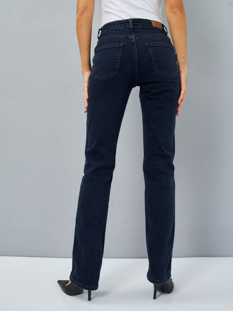 Женские классические джинсы с пятью карманами. Посадка Regular fit (полуоблегающие по бедру). Для улучшения посадки по талии сделан подкройной пояс из 2-х частей. Средняя высота талии спереди и высокая сзади. Застежка на молнии. Немного зауженные к низу. Выполнены из слабоэластичной ткани denim comfort stretch, цвет ткани Blue/Black(лицевая сторона ткани темно-синяя, изнаночная сторона- черная). Темная стирка "stone wash". Параметры указаны для размера 28. Длина внутреннего шва - 82, 0 см.
