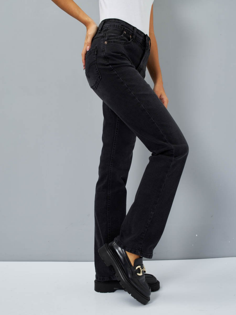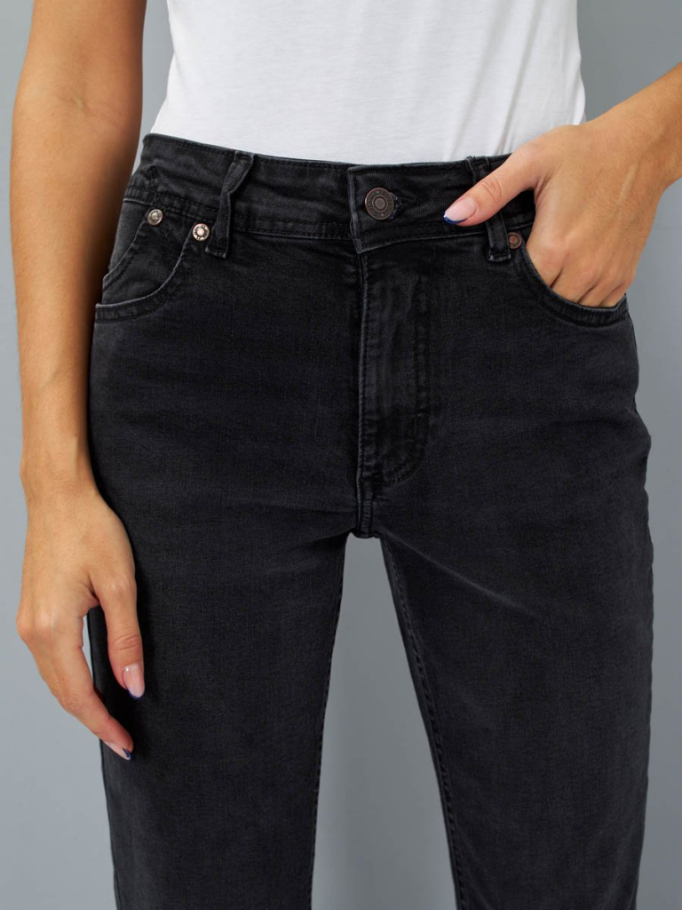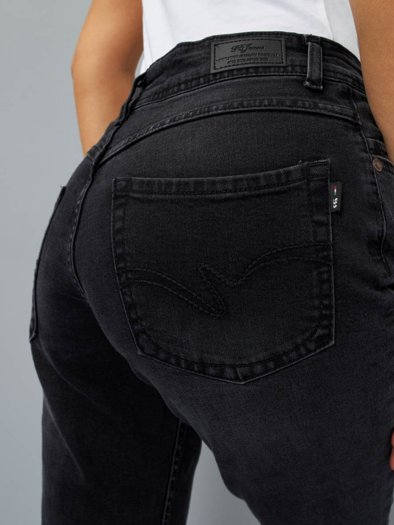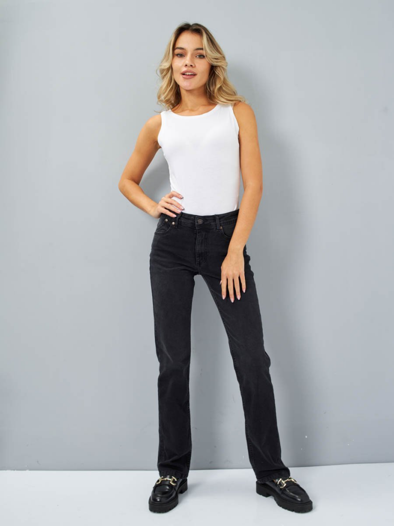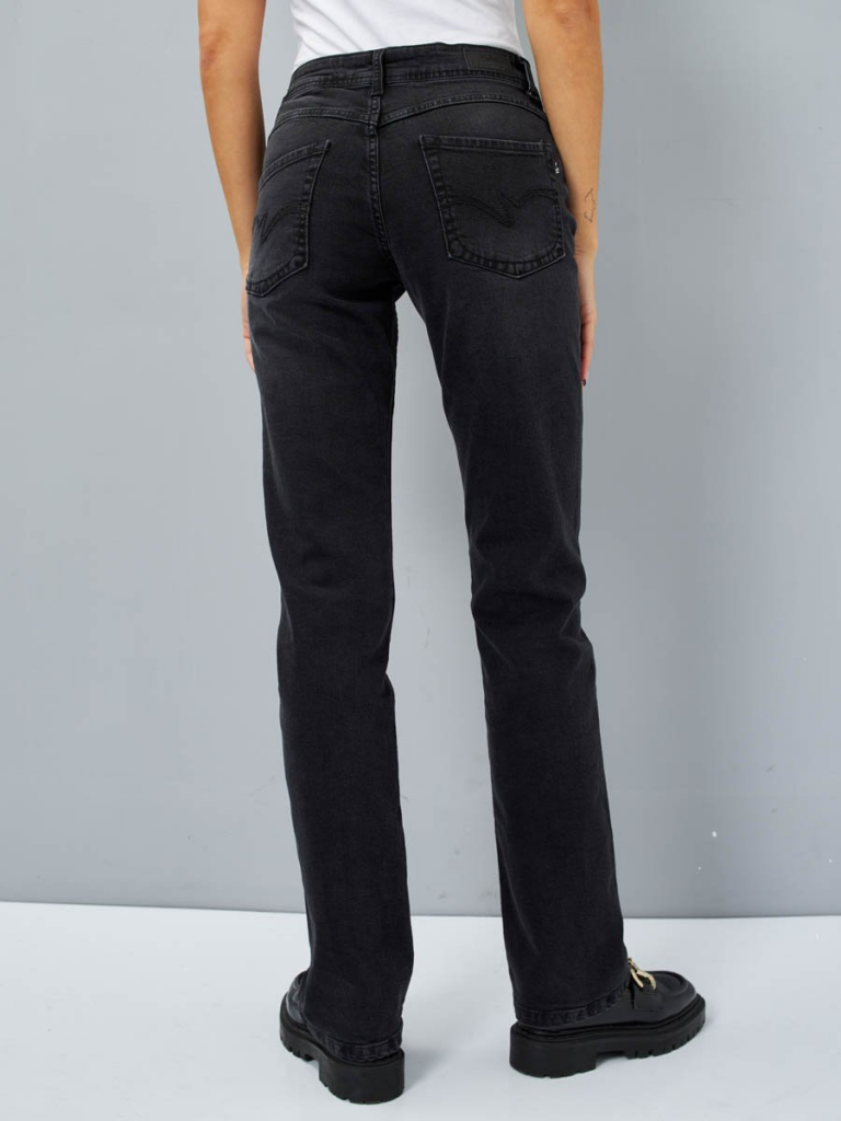 Женские классические джинсы с оригинальным дизайном часового кармана. Посадка Regular fit (полуоблегающие по бедру). Средняя высота талии спереди и высокая сзади. . Застежка на молнии. Прямые к низу от колена. Для улучшения посадки по талии сделан подкройной пояс из 2-х частей. Выполнены из слабоэластичной ткани denim comfort stretch цвет ткани Black/Black (лицевая и изнаночная стороны ткани черные). Темная стирка со слабовидимыми потёртостями и "усами" спереди и потёртостями сзади. Параметры указаны для размера 28. Длина внутреннего шва - 82, 0см.