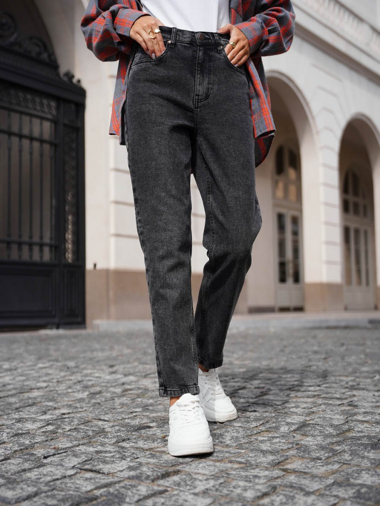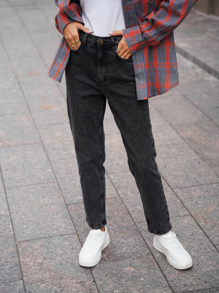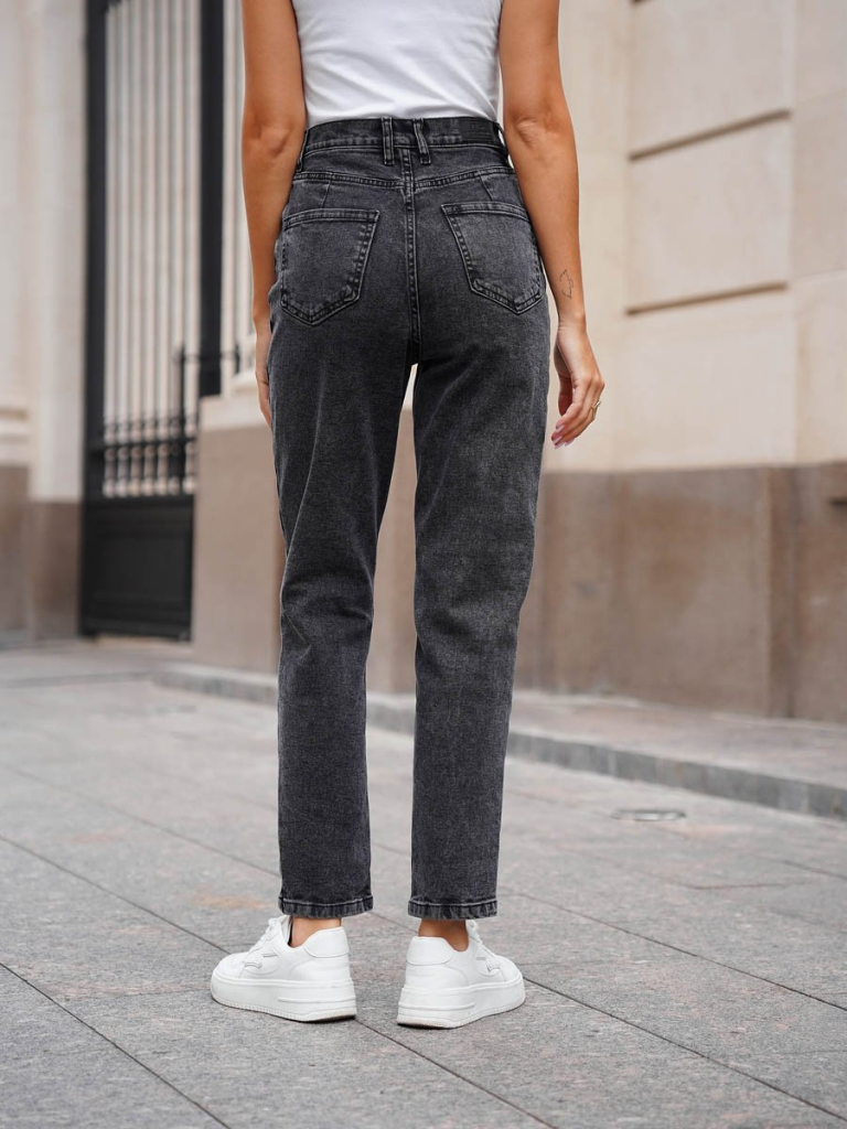 Женские классические ретро джинсы с пятью карманами с использованием лучших традиций 90-х. Посадка Mom fit, высокая талия спереди и сзади, свободные в бедре и зауженные к низу укороченной длины. Застежка на молнии. Выполнены из слабоэластичной ткани denim comfort stretch, цвет ткани Black/Black (лицевая и изнаночная стороны ткани черные). Специальная темная стирка "towel wash", мраморный эффект.