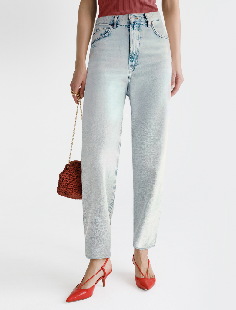 Джинсы mom-fit выполнены из эластичного денима. Модель в голубом оттенке с декоративной стиркой, хорошо впишется в непринужденный повседневный образ с вещами и нейтральной, и яркой гаммы. Комфортная посадка на талии подходит для любой фигуры, ткань хорошо тянется и не сковывает движений. Изделие дополнено патчем из эко-кожи с логотипом бренда.