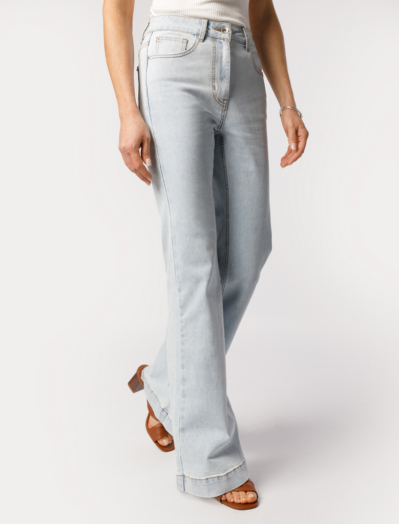 Джинсы-клеш в голубом оттенке выполнены из эластичного денима. Модель с декоративной стиркой и контрастной бежевой строчкой. Высокая посадка акцентирует талию и вытягивает силуэт. Изделие дополнено брендированным патчем. Подходит для любого типа фигуры.