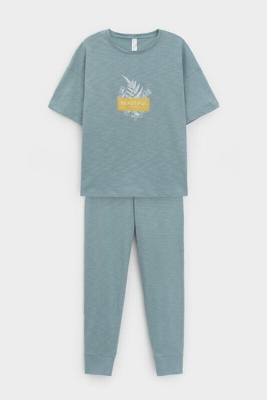Легкий комплект для комфортного сна и отдыха. Футболка с принтом и спущенной линией плеча комфортно садится по фигуре. Брюки с эластичными манжетами с боковыми карманами. Круглый шнур позволяет регулировать посадку. Гладкий материал приятен к телу и позволяет коже дышать.