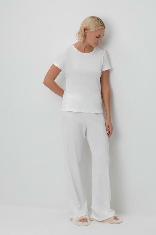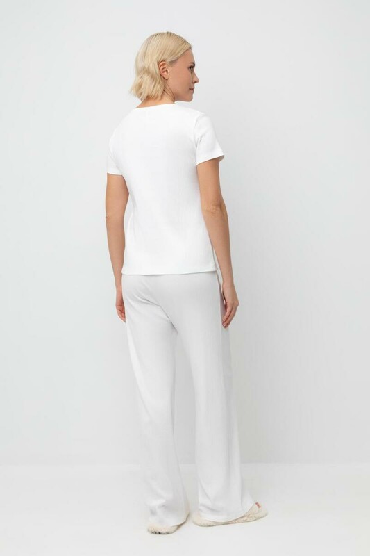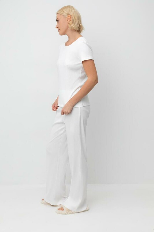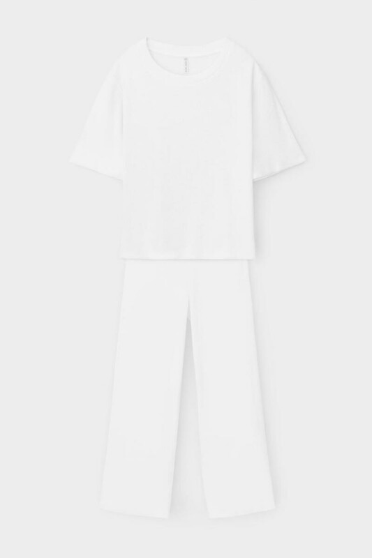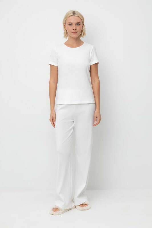 Комплект из нежнейшего высококачественного трикотажного полотна с добавлением спандекса. За счет фактуры переплетения и специальных обработок сохраняет силуэт и форму. Свободный крой футболки и мягкий пояс на брюках обеспечивают легкость и свободу движений.