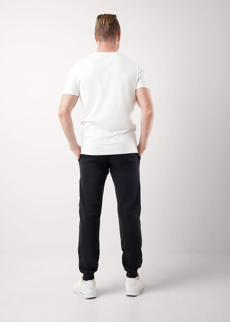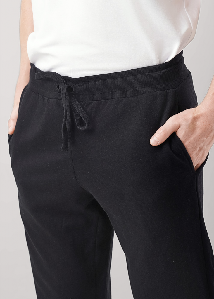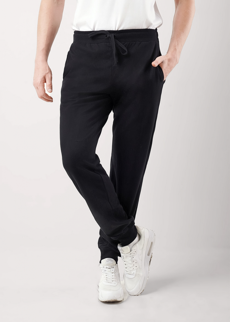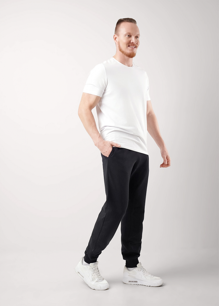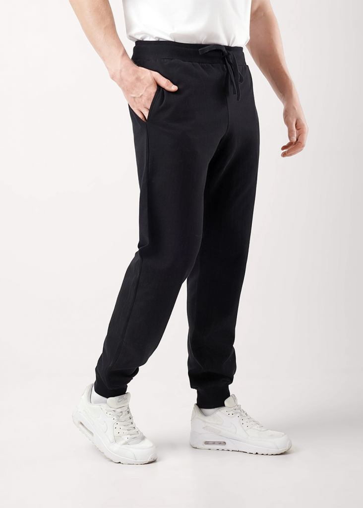 Брюки на манжете из трикотажного полотна - футер с эластичным поясом из кашкорсе со шнуром комфортно облегает фигуру, а посадка не сковывает движения. Модель дополняют боковые карманы.