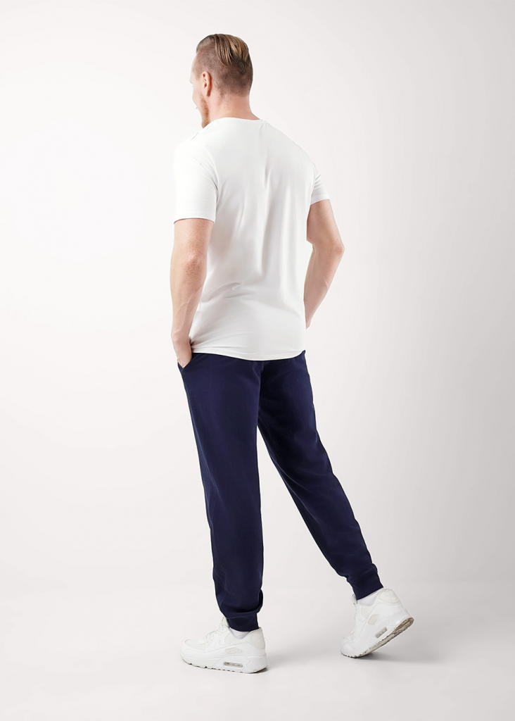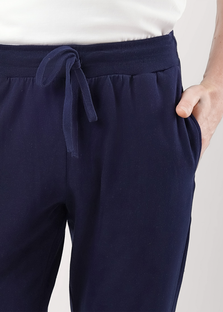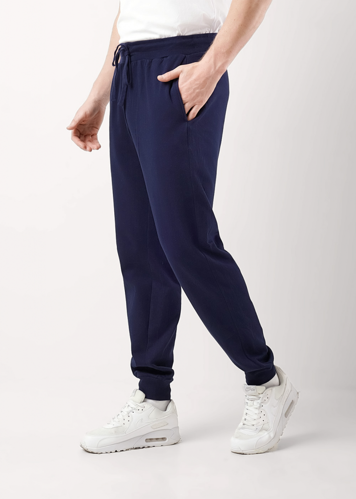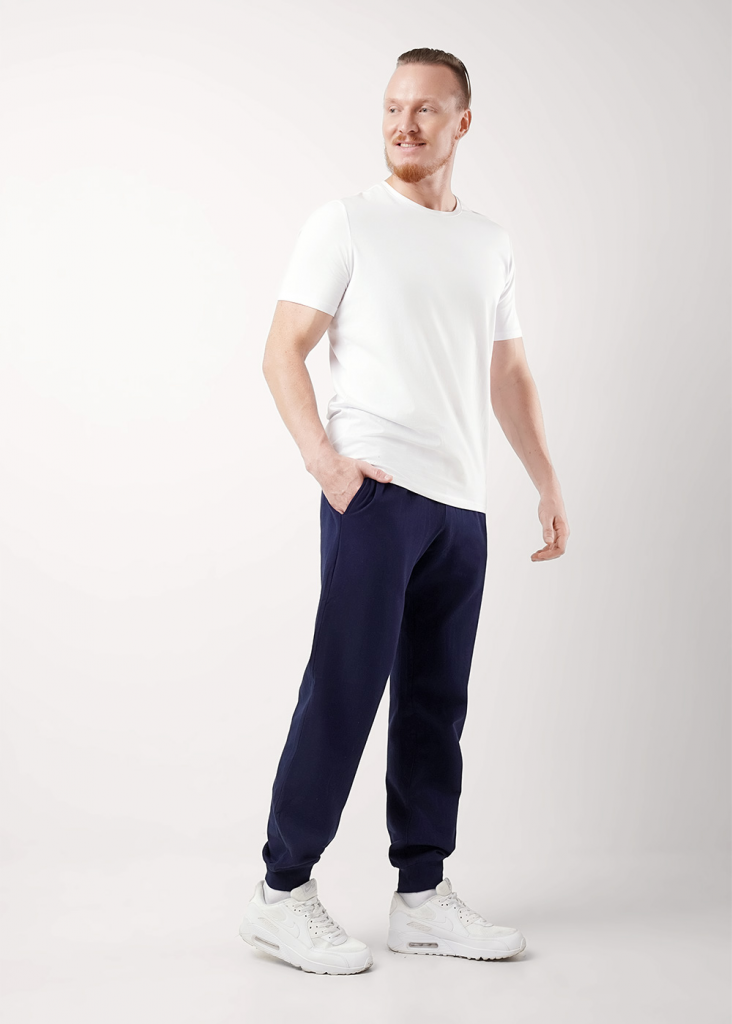 Брюки на манжете из трикотажного полотна - футер с эластичным поясом из кашкорсе со шнуром комфортно облегает фигуру, а посадка не сковывает движения. Модель дополняют боковые карманы.
