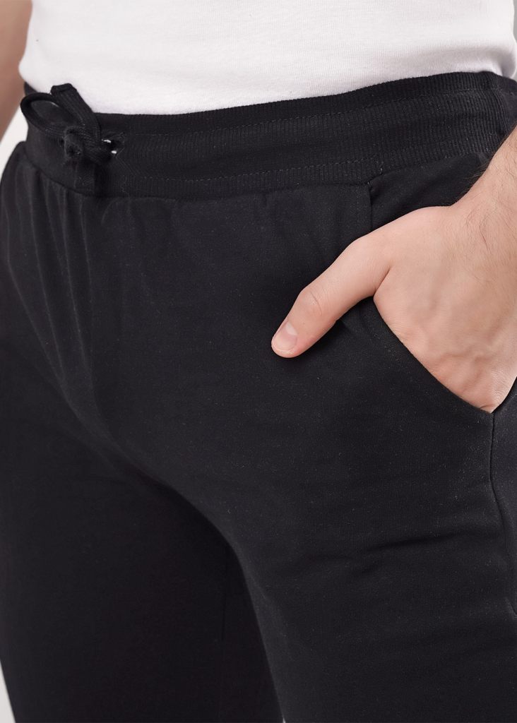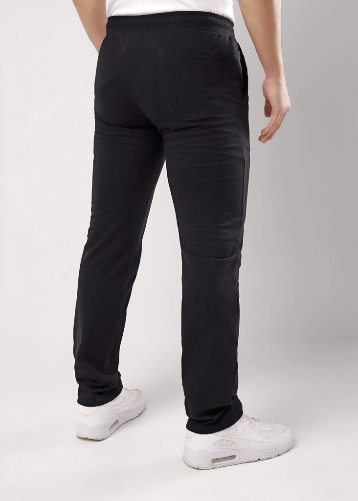 Брюки с отрезным поясом из кашкорсе, двумя карманами в боковых швах и одним накладным карманом сзади.