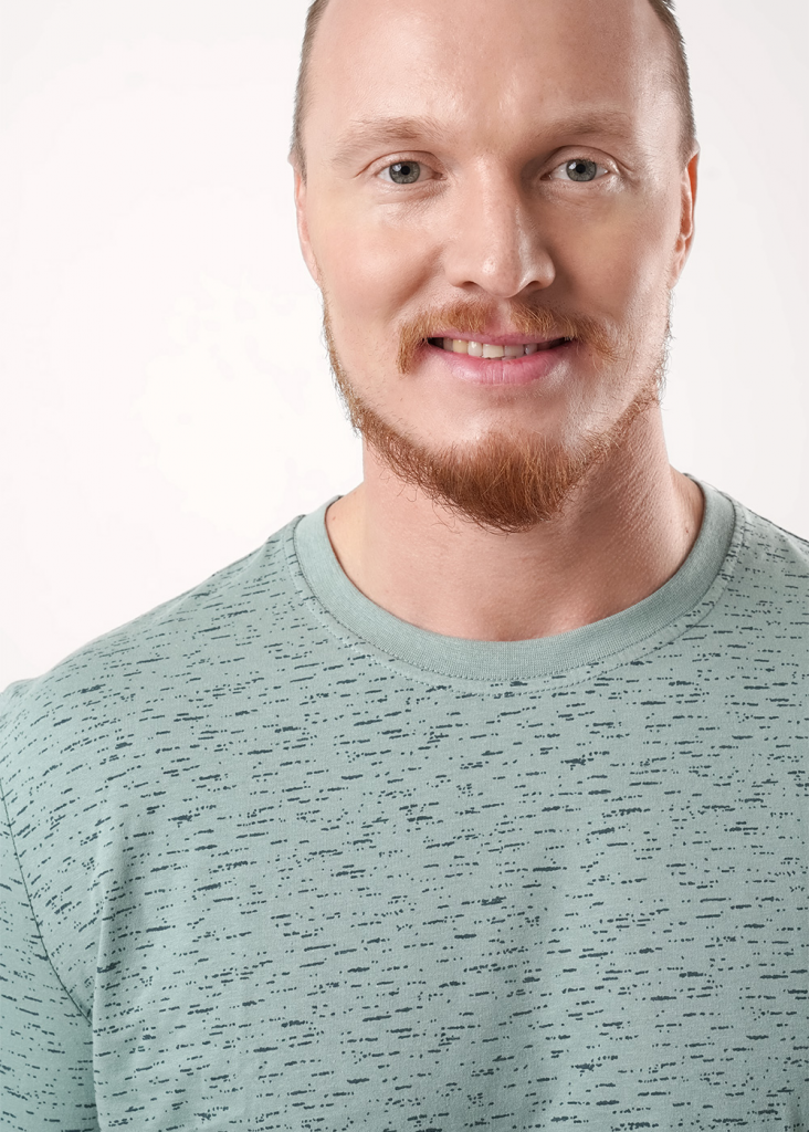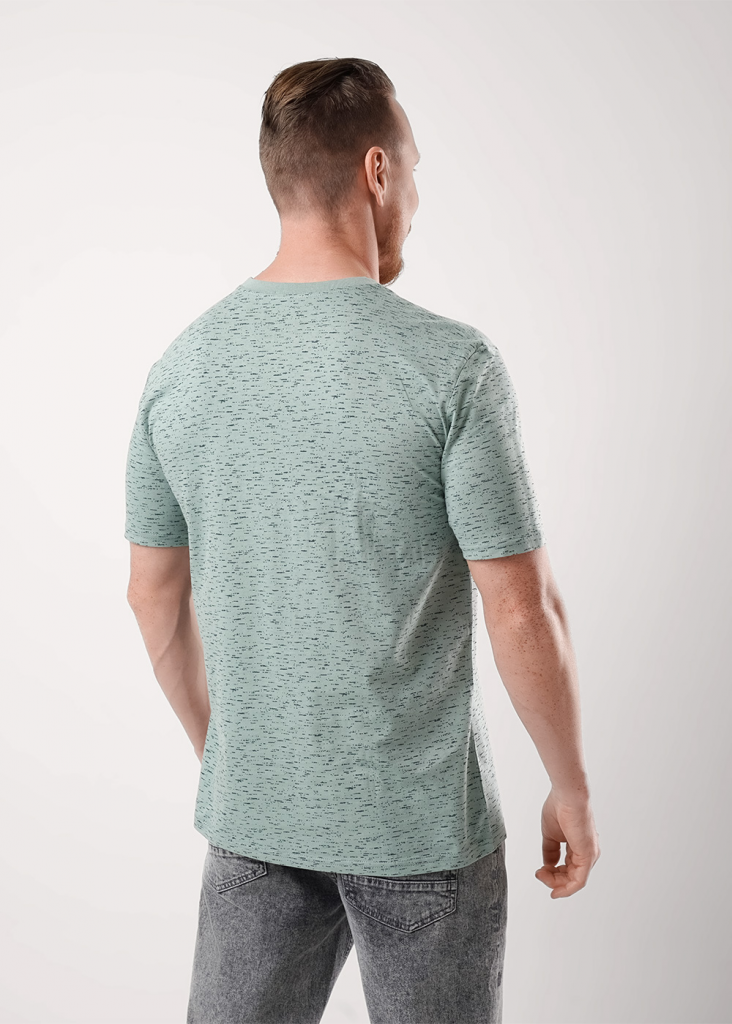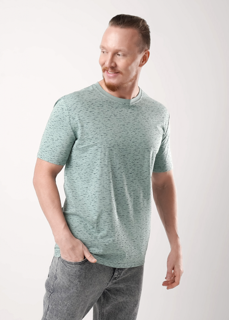 Фуфайка с коротким рукавом среднего объема, круглым вырезом горловины, которая оформлена обтачкой из рибаны, выполненная из набивного полотна.