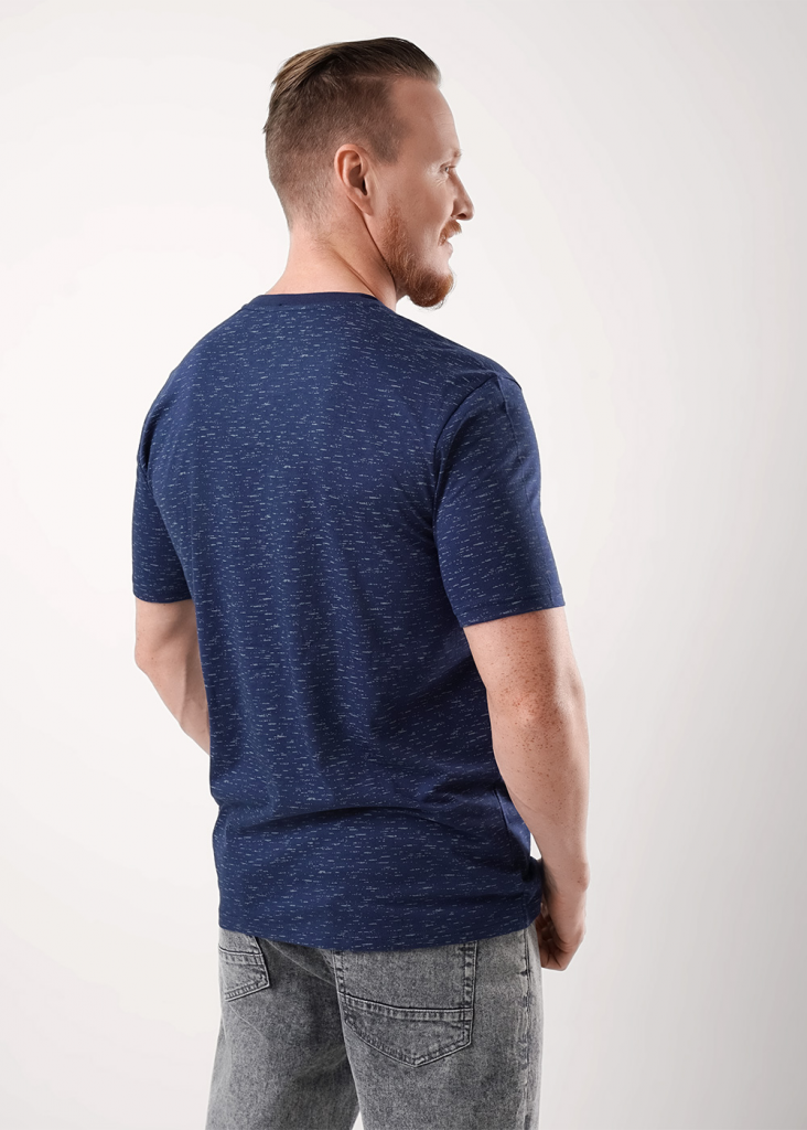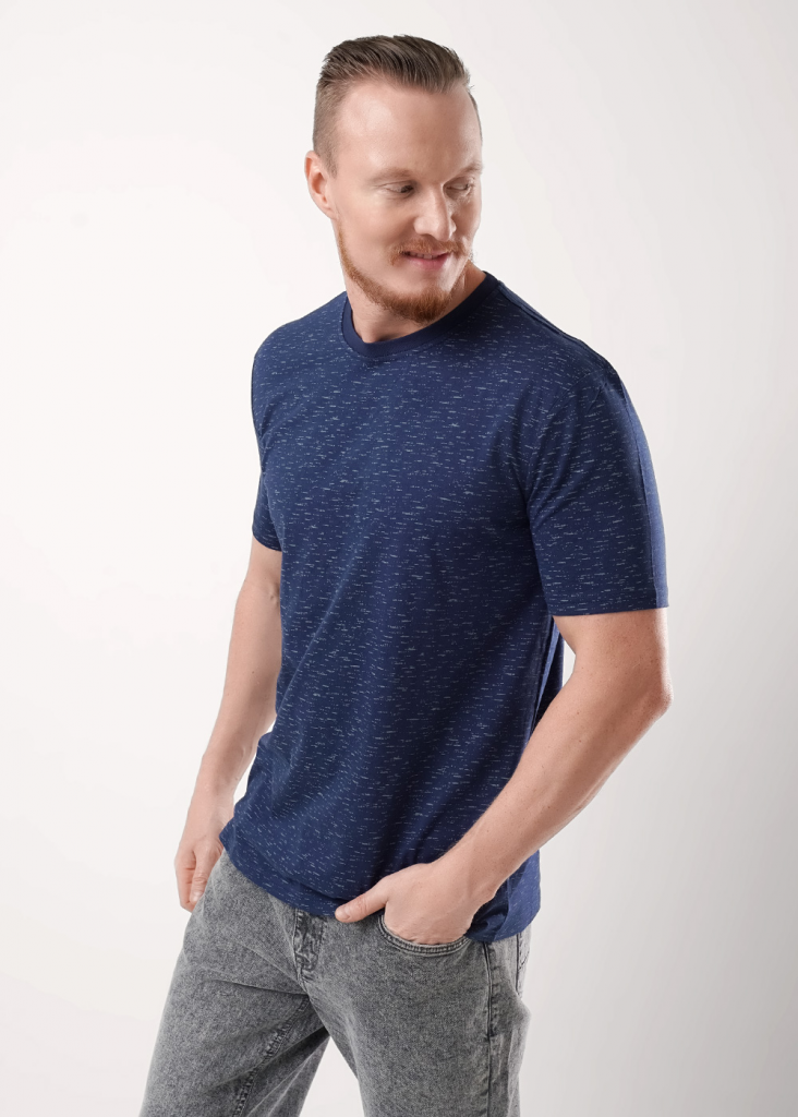 Фуфайка с коротким рукавом среднего объема, круглым вырезом горловины, которая оформлена обтачкой из рибаны, выполненная из набивного полотна.
