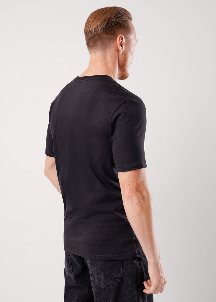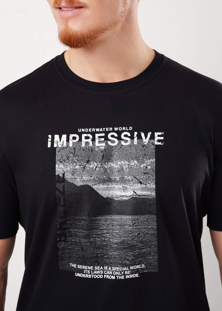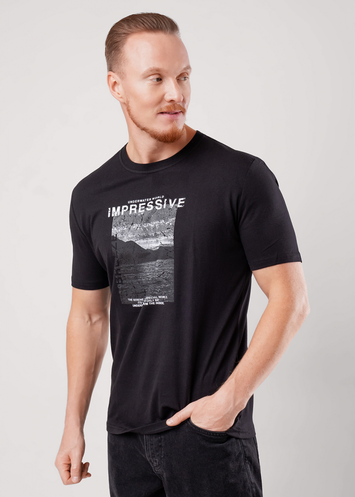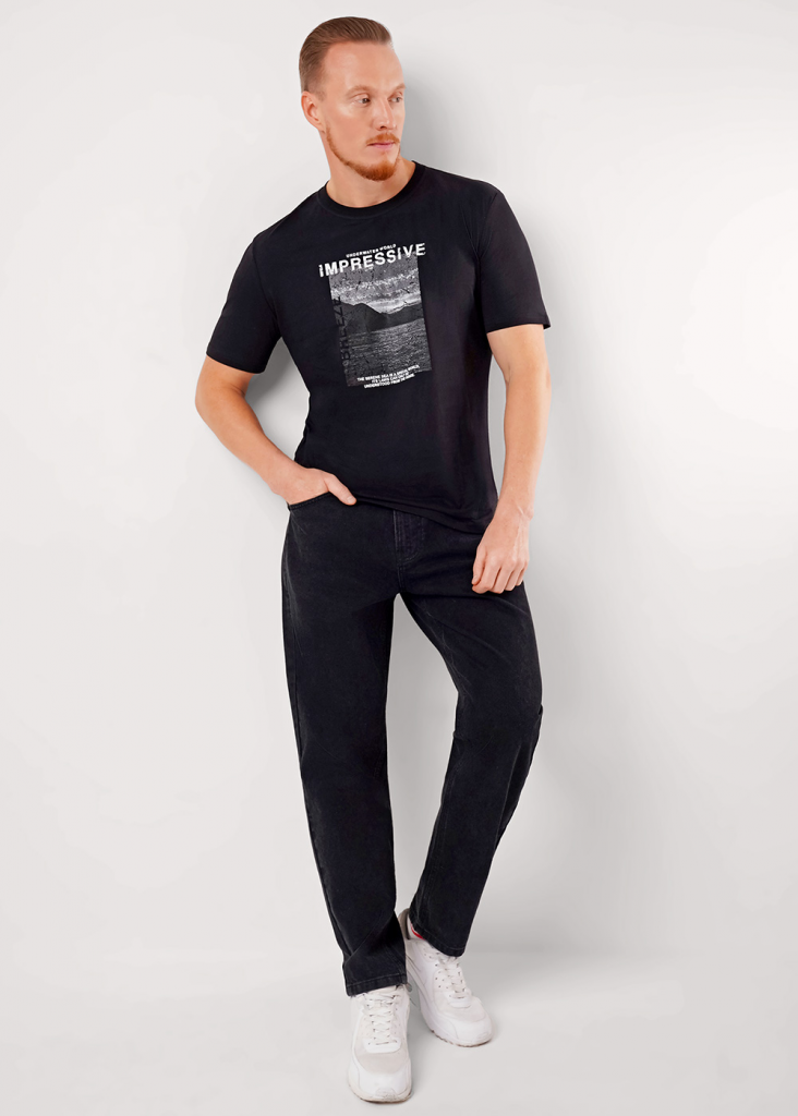 Фуфайка с коротким рукавом среднего объема, круглый вырез, горловина оформлена обтачкой из рибаны. Дополнена оригинальным принтом.