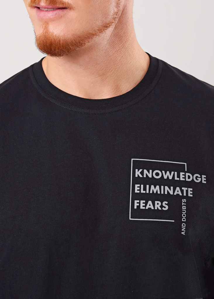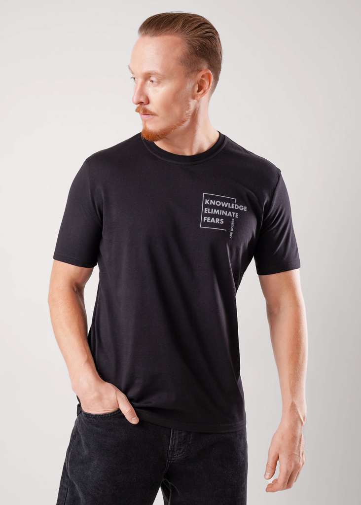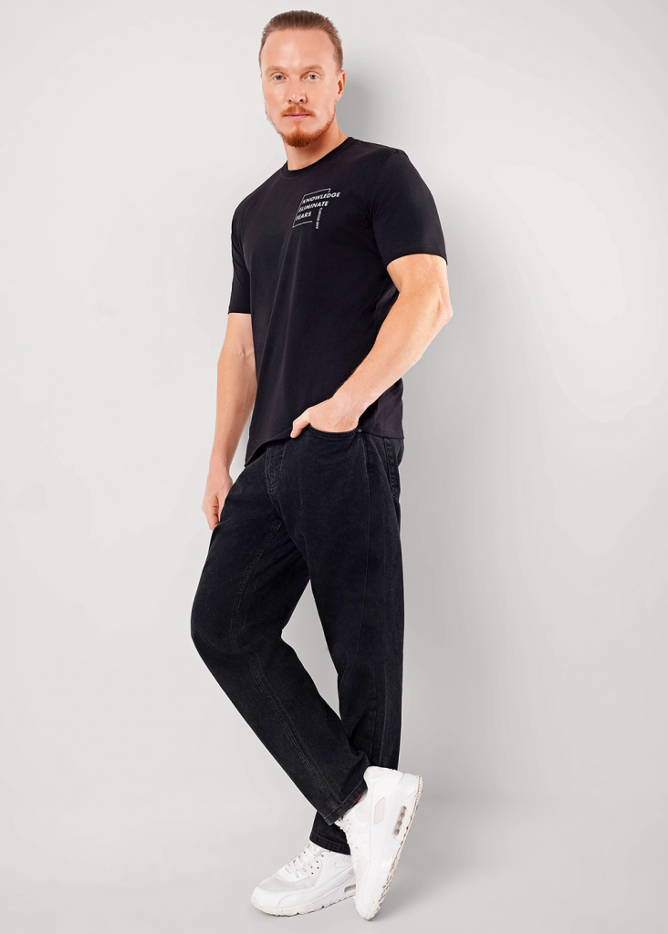 Фуфайка с коротким рукавом среднего объема, круглый вырез, горловина оформлена обтачкой из рибаны. Дополнена оригинальным принтом.