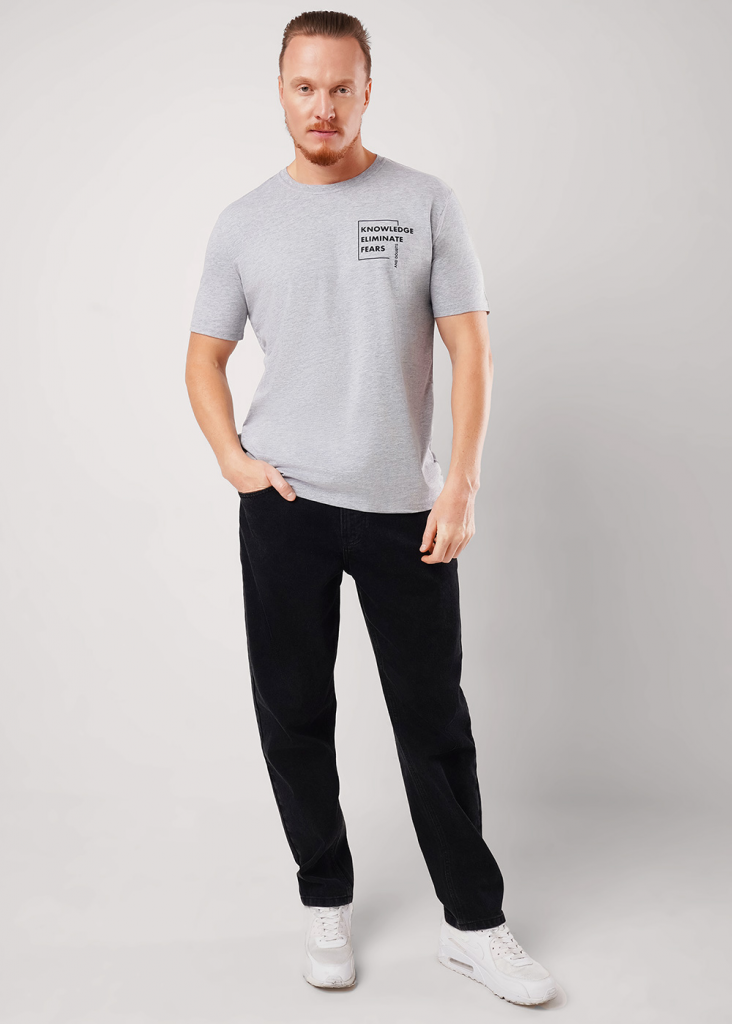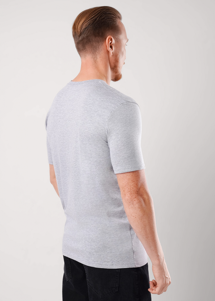 Базовая однотонная футболка стандартного объема с круглой горловиной, втачным рукавом из хлопкового меланжевого полотна с добавлением эластана. Является неотъемлемой частью мужского гардероба.