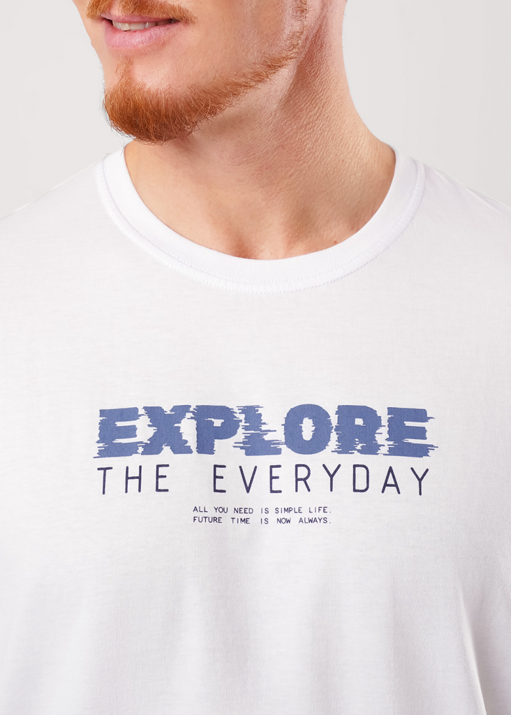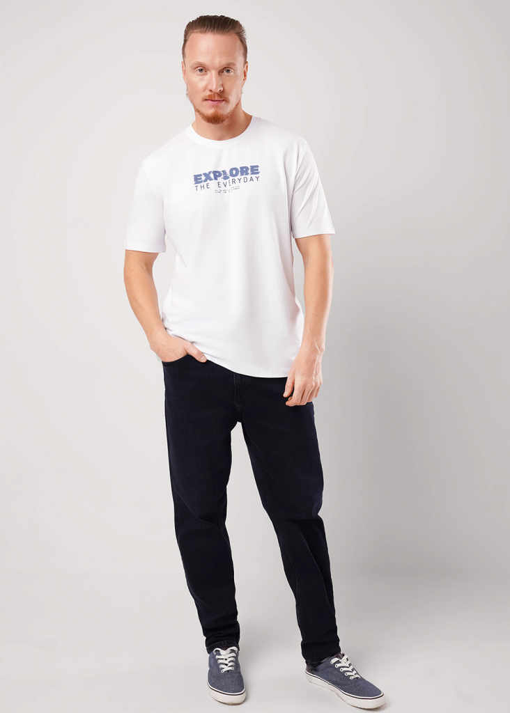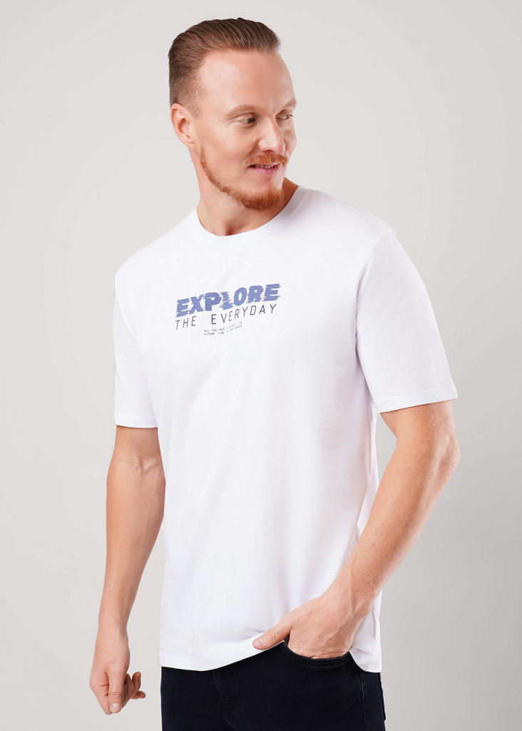 Фуфайка с коротким рукавом среднего объема, с оригинальным принтом, круглым вырезом горловины, которая оформлена обтачкой из рибаны.