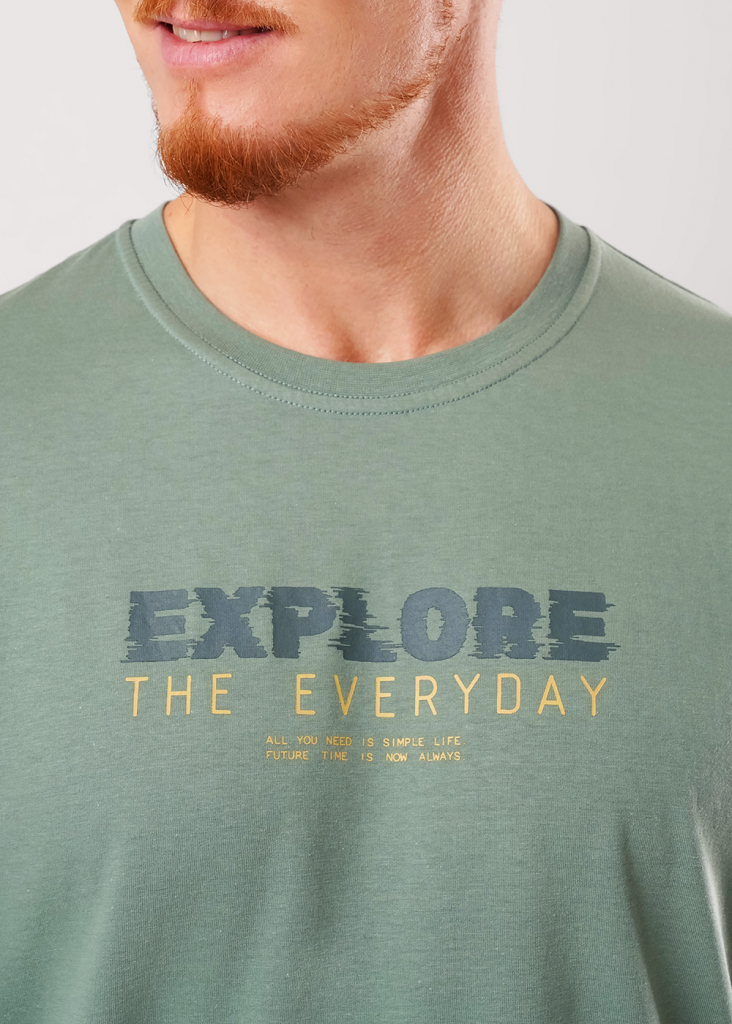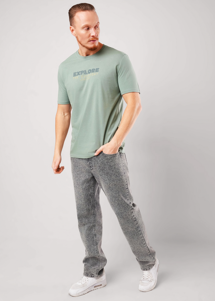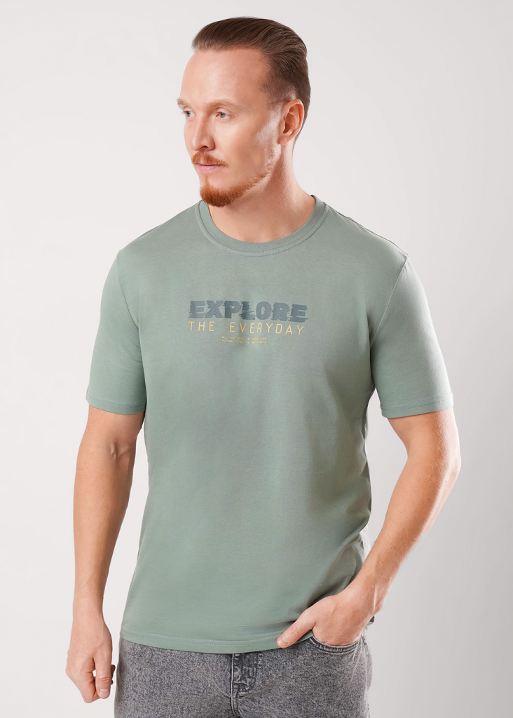 Фуфайка с коротким рукавом среднего объема, с оригинальным принтом, круглым вырезом горловины, которая оформлена обтачкой из рибаны.