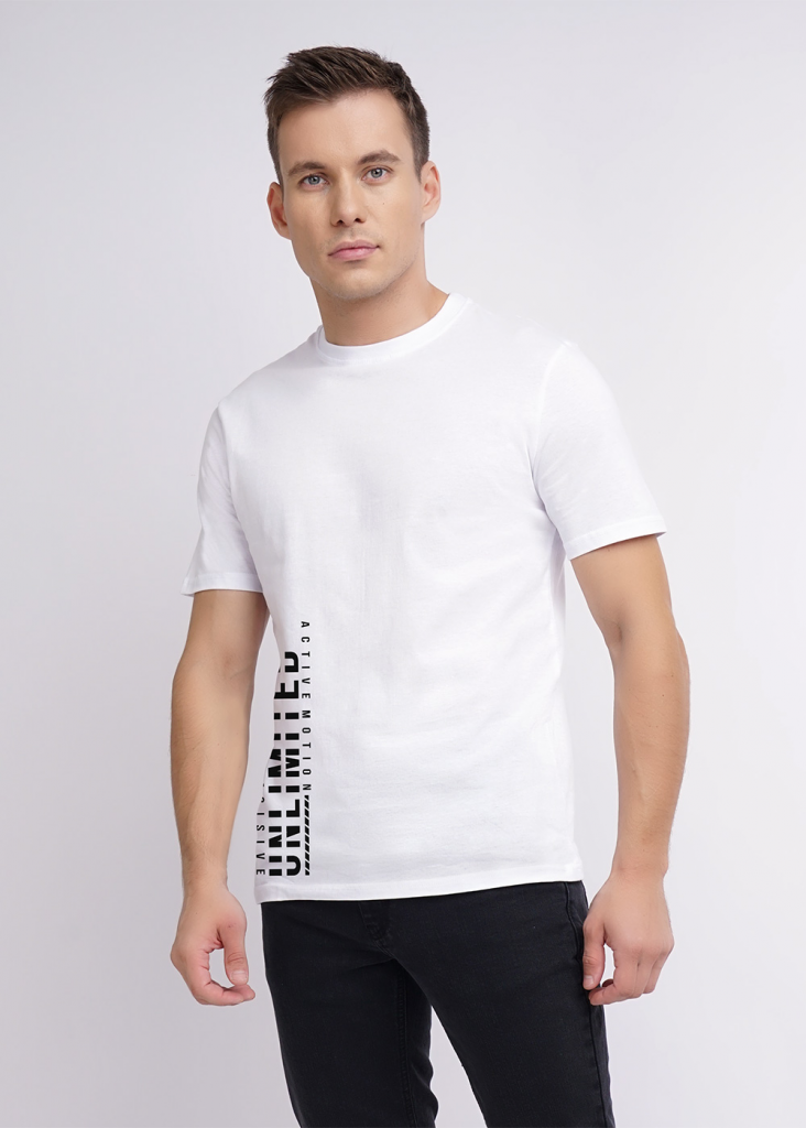 Фуфайка с коротким рукавом среднего объема, с оригинальным принтом, круглым вырезом горловины, которая оформлена обтачкой из рибаны.