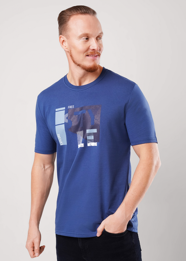 Фуфайка с коротким рукавом среднего объема, с оригинальным принтом, круглым вырезом горловины, которая оформлена обтачкой из рибаны.