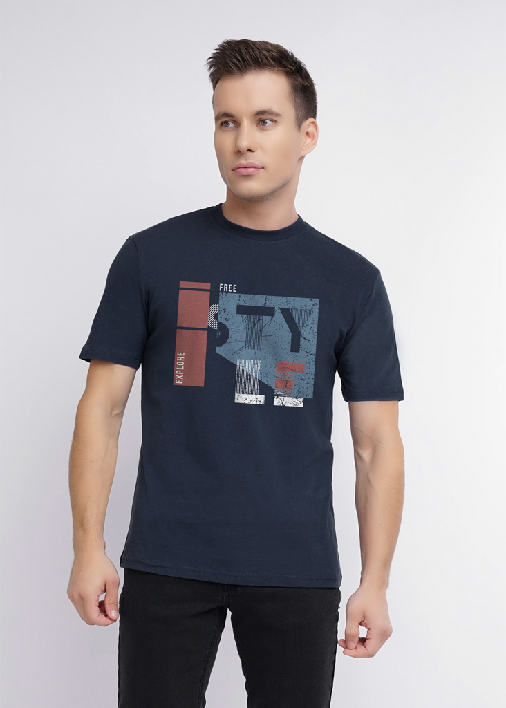 Фуфайка с коротким рукавом среднего объема, с оригинальным принтом, круглым вырезом горловины, которая оформлена обтачкой из рибаны.