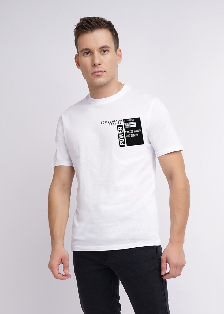 Фуфайка с коротким рукавом среднего объема, с оригинальным принтом, круглым вырезом горловины, которая оформлена обтачкой из рибаны.