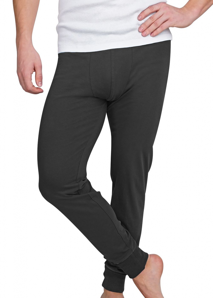 Мужские хлопковые кальсоны свободной посадки с нефункциональным гульфиком, на внутренней резинке и манжетами по низу.