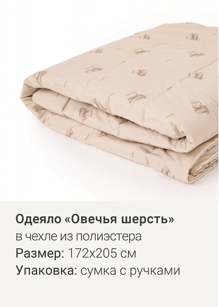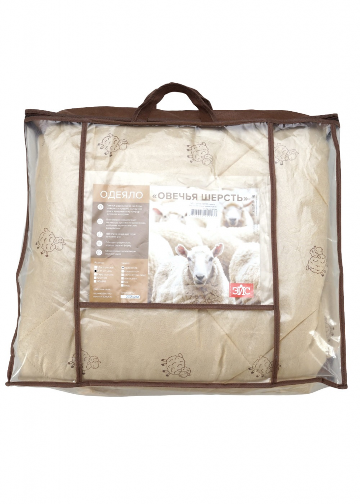 Одеяло 2х-спальное, облегченное, стеганое с кантом. Наполнитель: термополотно из овечьей шерсти 150г/м2. Ткань чехла: полиэстер, плотность 60 г/м2. Цвет- бежевый, тематика "Овечка" Упаковка: сумка