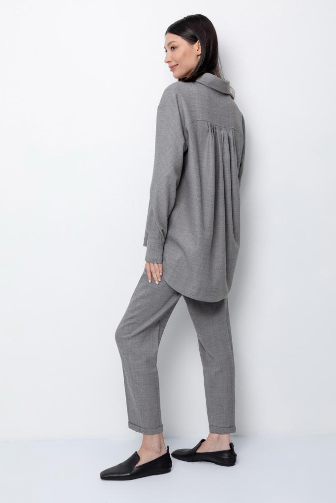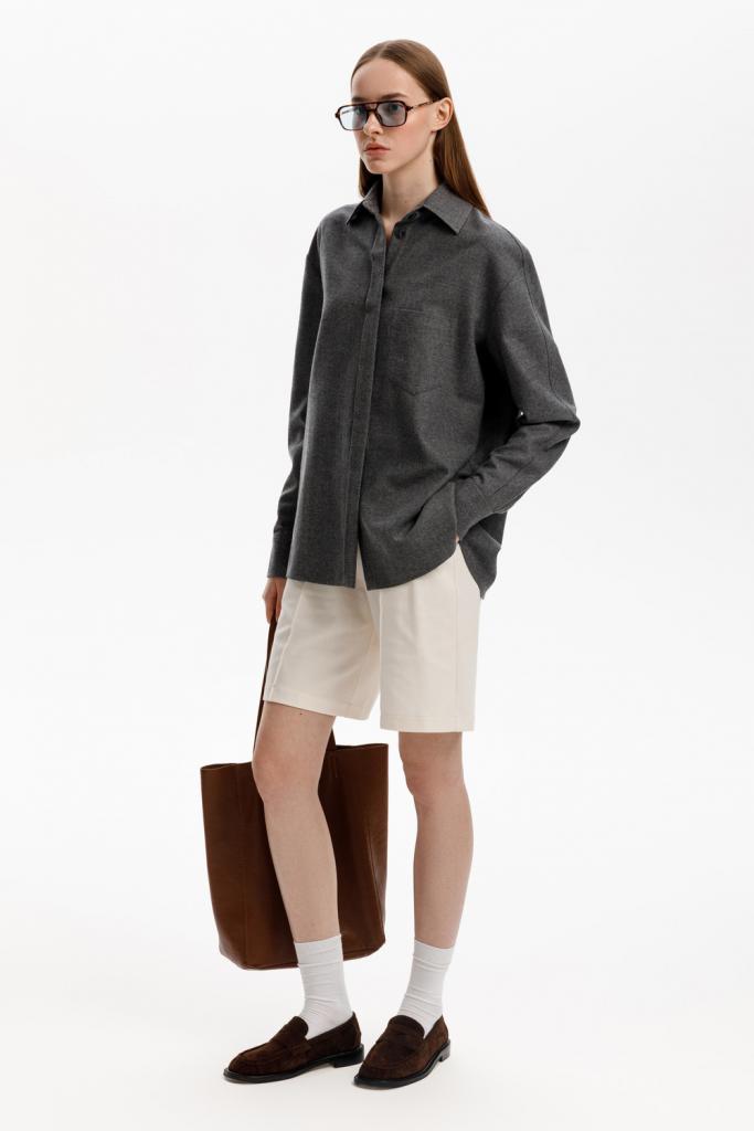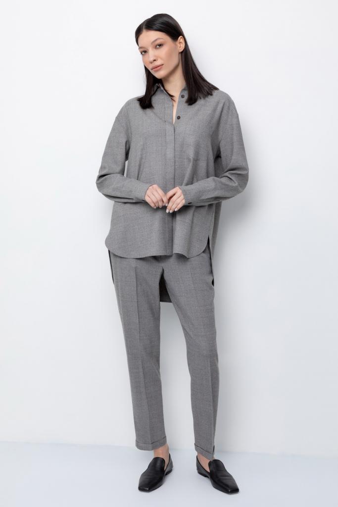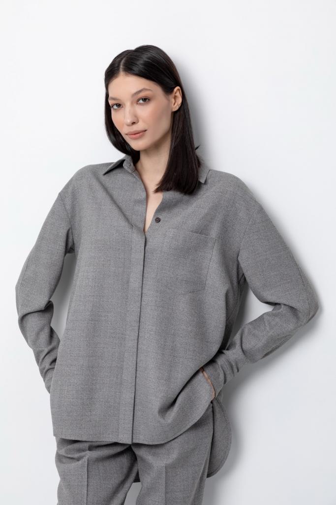 Рубашка из мягкой меланжевой ткани с добавлением шерсти, свободного кроя с отложным воротником, удлиненной спинкой и слегка спущенной линией плеча, длинными рукавами с манжетами и застежкой на пуговицы.