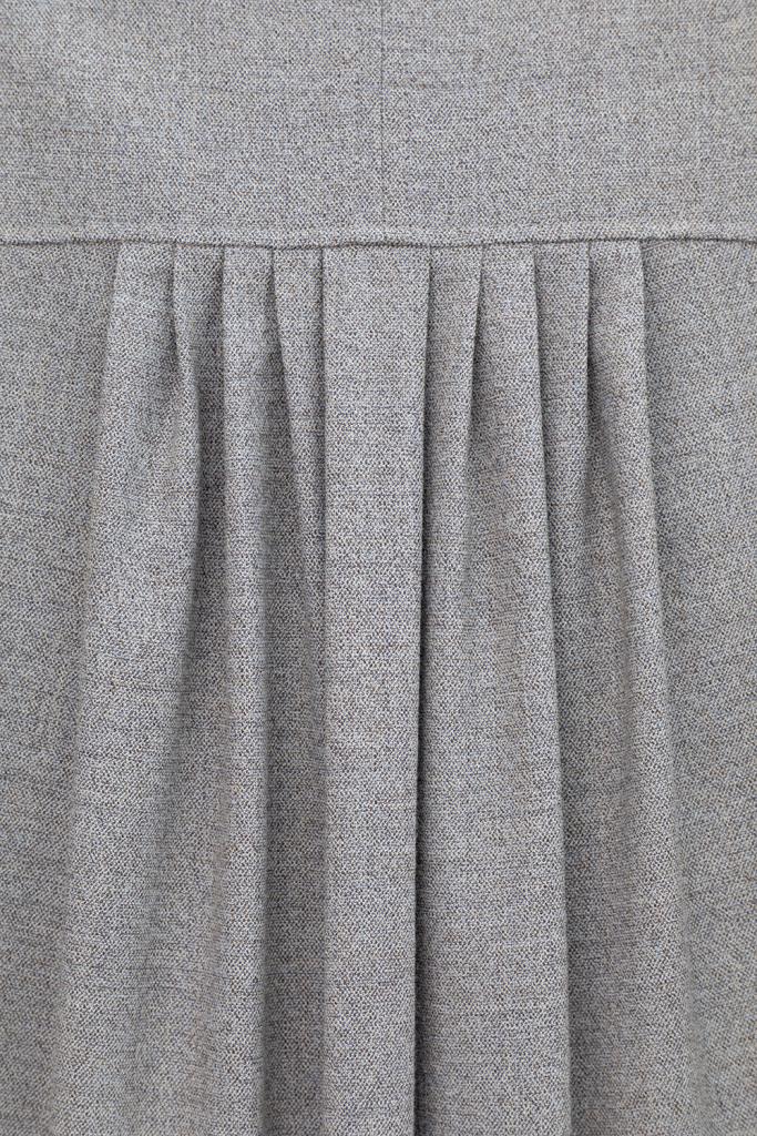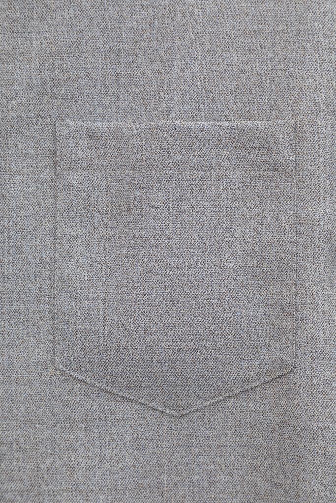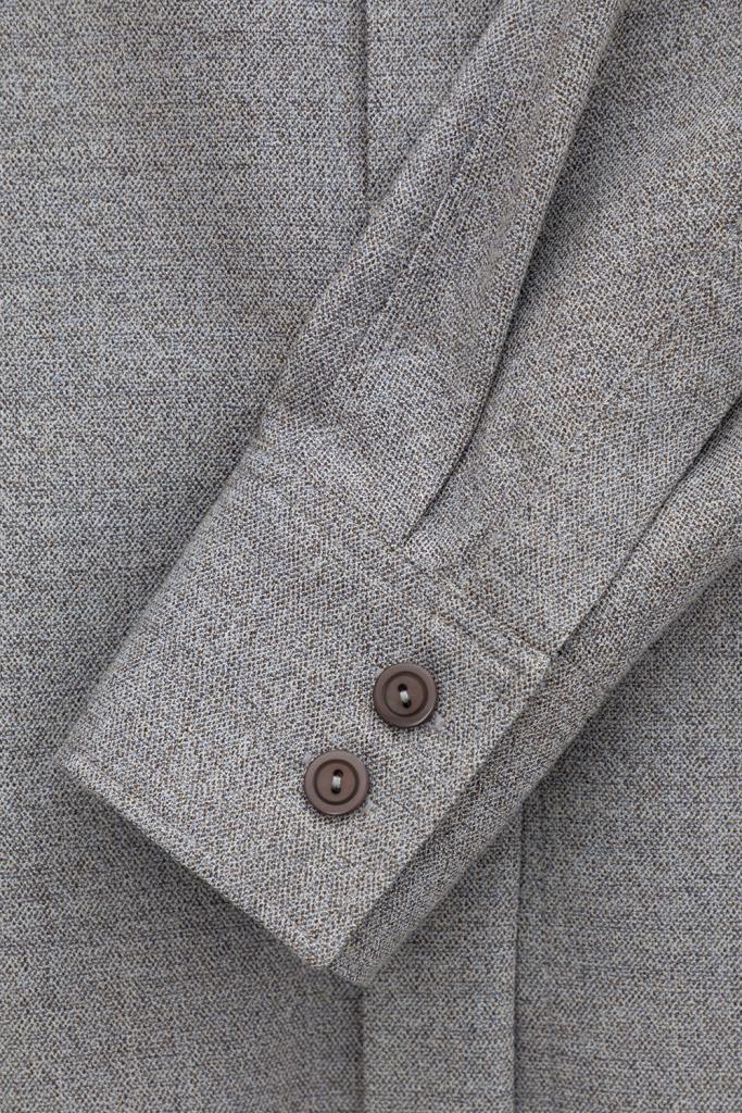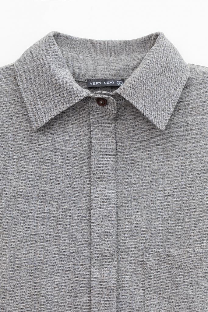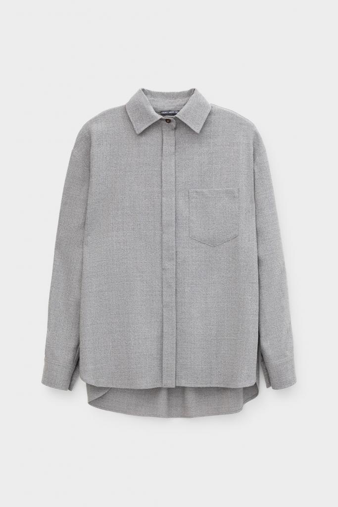 Рубашка из мягкой меланжевой ткани с добавлением шерсти, свободного кроя с отложным воротником, удлиненной спинкой и слегка спущенной линией плеча, длинными рукавами с манжетами и застежкой на пуговицы.