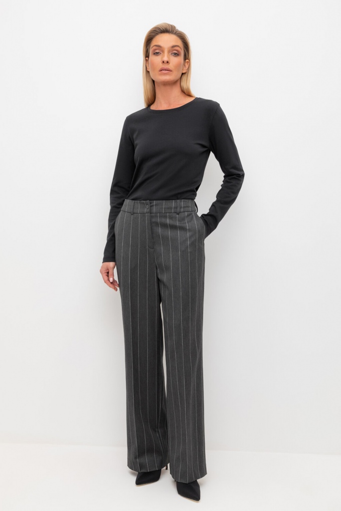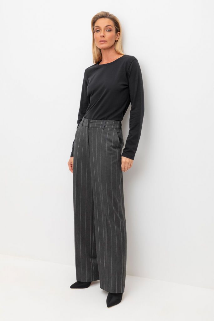 Широкие брюки из шерсти с завышенной линией талии. Застегивается спереди на молнию и пуговицу. Пояс со шлевками для ремня.